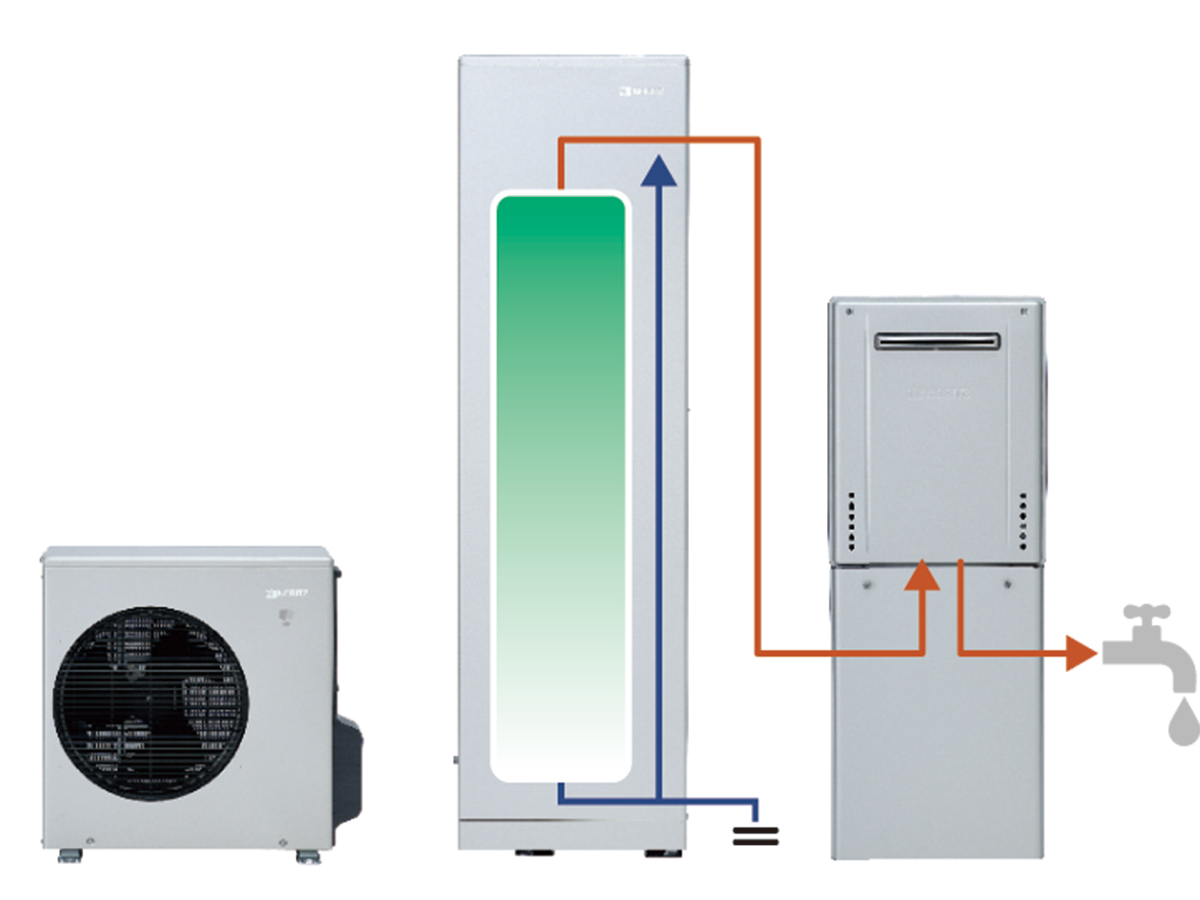 例えば、太陽光発電システムや蓄電池などを組み合わせれば、断水していない限り災害後にヒートポンプでお湯を沸かすことが可能だし、停電のみの場合は同様に太陽光発電や蓄電池の電気とバックアップ熱源機を使ってお湯が沸かせる。まさにハイブリッドならではのメリットを享受できるのだ。