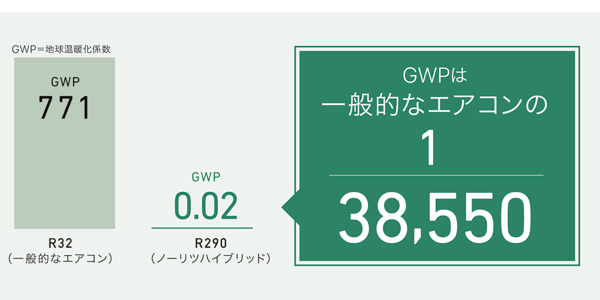 国内のハイブリッド給湯機で業界唯一(※2)「自然冷媒R290」を採用。普段使いの場合CO2の排出量を大幅に削減する。冷媒回収が不要なので、買い替え時の冷媒回収費用もかからない。