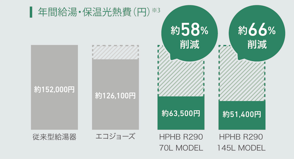 「HPHB R290」はタンクの貯湯量が選べる2モデルを用意。貯湯量145Lモデルは「給湯・ふろ」タイプ(82万8080円)、「給湯・ふろ・温水暖房」タイプ(91万8060円)。貯湯量70Lモデルは「給湯・ふろ」タイプ(77万8580円)、「給湯・ふろ・温水暖房」タイプ(86万8560円)。