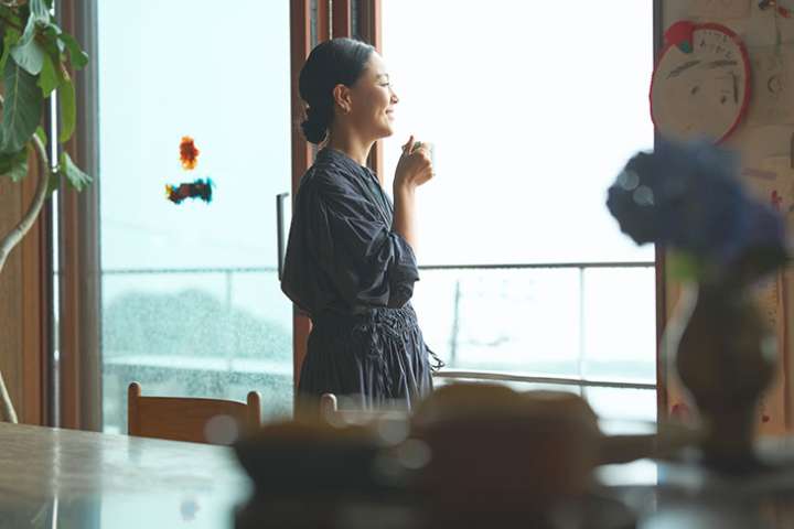 海を眺めながら過ごすティータイムは、慌ただしい生活を整えるための大切な時間。オーツミルクを入れたコーヒーや、疲れている時は漢方茶やヨモギ茶を飲むこともあるのだとか。