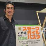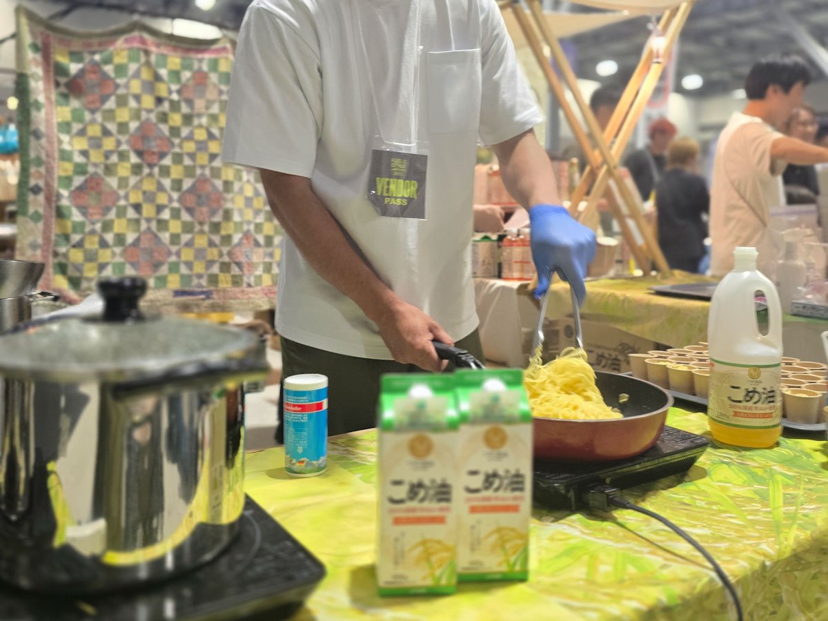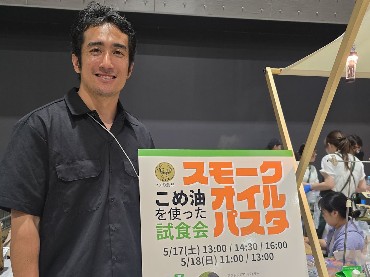 その魅力を体験できるイベントが、5月開催されました。それが、アジア最大級の暮らしと遊びの総合展示『FIELDSTYLE EXPO 2025』。『つの食品』は2回目の出展となり、今回は、「オイルスモークパスタ」の実演を通じて、こめ油の新たな使い方を提案しました。