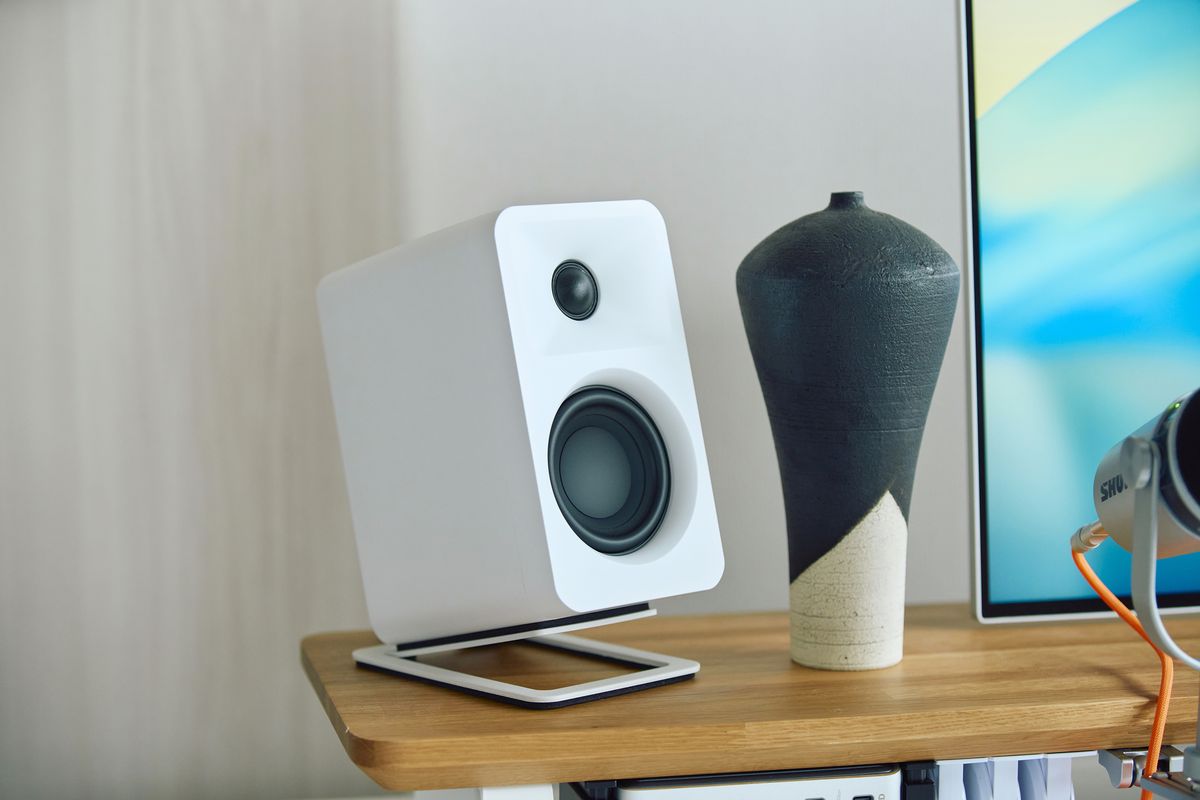 クリーンでスマートなデスクに似合うスピーカーを探して辿り着いたのは、ロゴすらないシンプルな逸品 Kanto Audio「ORA」だった。