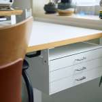 ▲プレダクツの昇降式デスクに引き出しモジュールを取り付けて、小物類を収納している