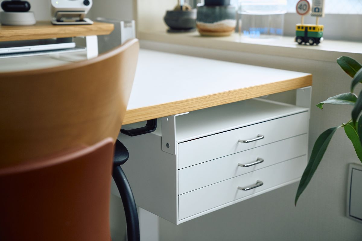 ▲プレダクツの昇降式デスクに引き出しモジュールを取り付けて、小物類を収納している