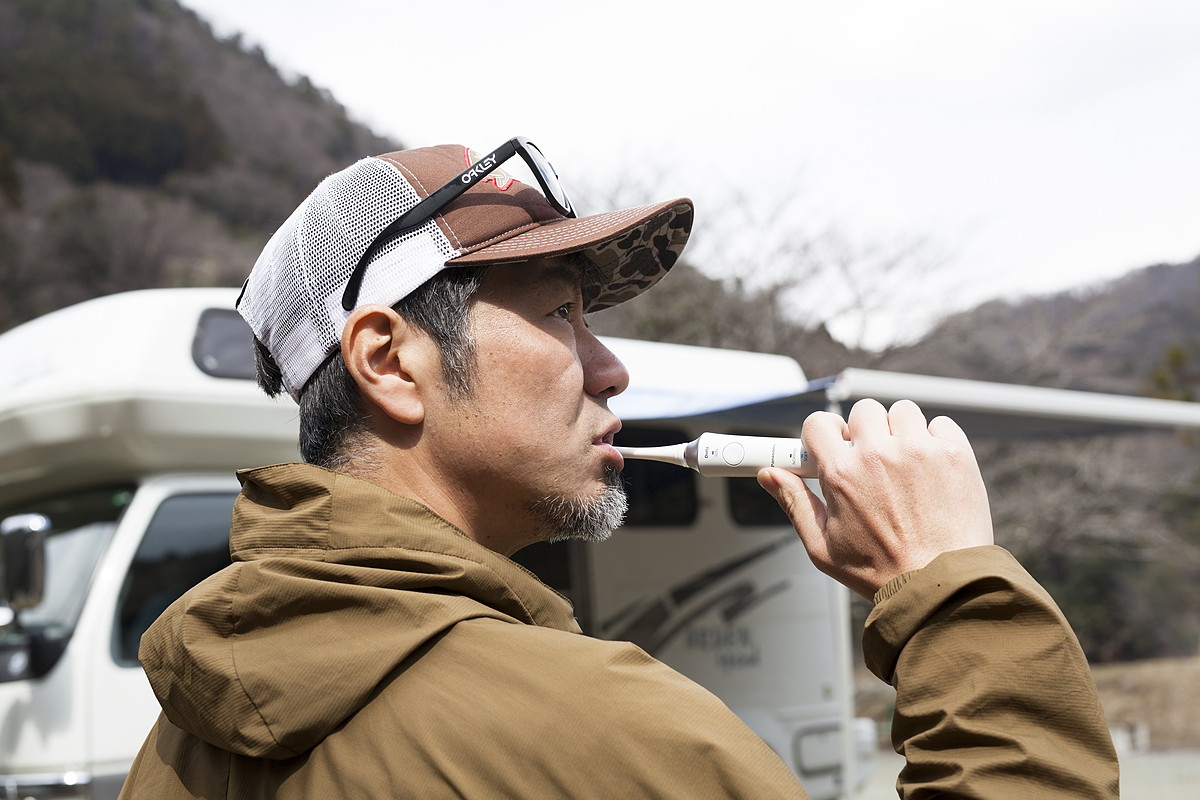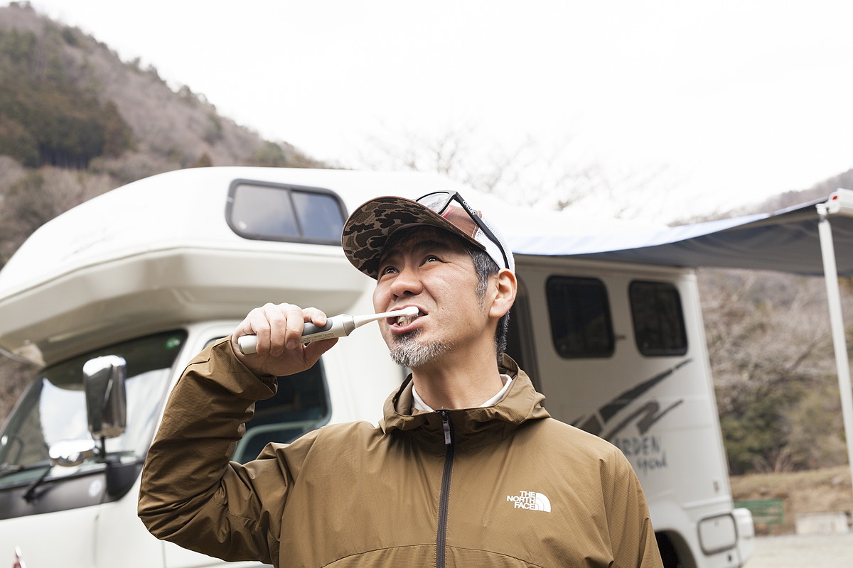 歯ブラシを使って手で磨いていた時には、歯磨き粉を使わないと、どうもスッキリしなかった。なんとなくの後ろめたさを感じながら、少量の歯磨き粉をブラシに付けて、磨いていたのだ。それがドルツなら、正直、歯磨き粉を使わなくても歯の中がスッキリ爽快に! 今回のようなクルマを使ったオートキャンプなら、気になるほどの大きさでもないし、これならアウトドアでも使える!