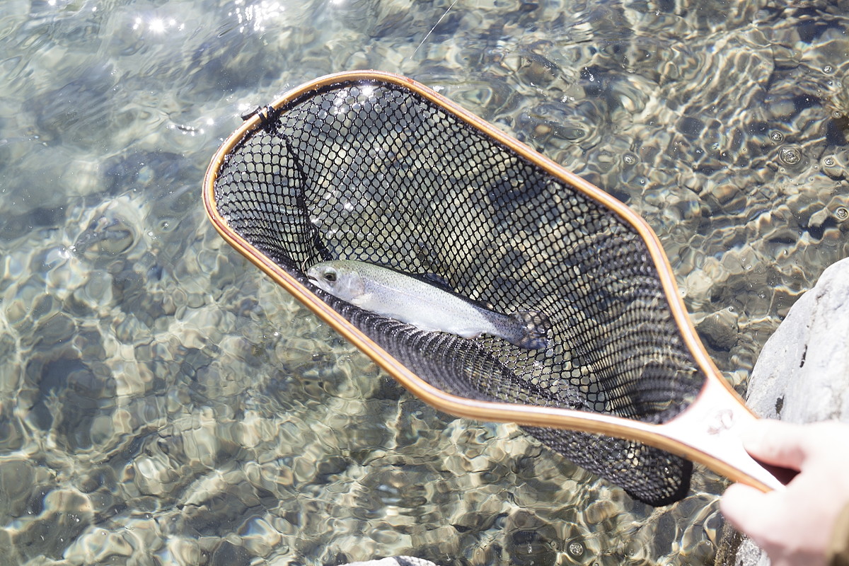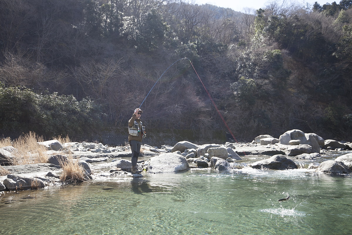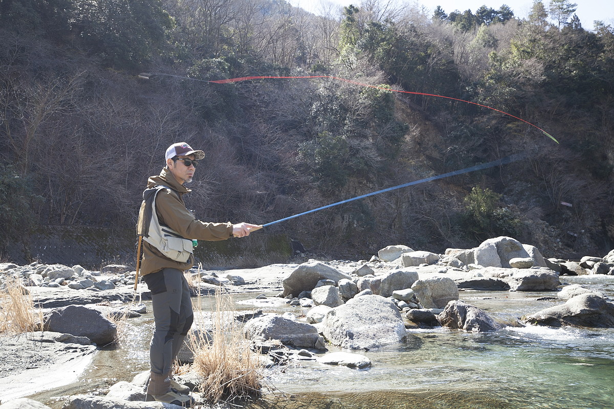 事前に川の様子を見たところ、川幅は6mほど。それならばと、今回は延べ竿に糸(ライン)と毛バリを付けた、シンプルな “テンカラ” でニジマスを狙うことにする。そもそもテンカラは日本で昔から採用されていた毛バリ釣り。厳密にはフライフィッシングとは違うが、リールが必要ないため、道具が少なくて済むのがポイント。昨今のトレンドである、荷物を極限まで軽くしていこうという、ウルトラライトな考え方とも相性がよく、欧米でも注目されている。そんなテンカラの準備を済ませて、いざ!