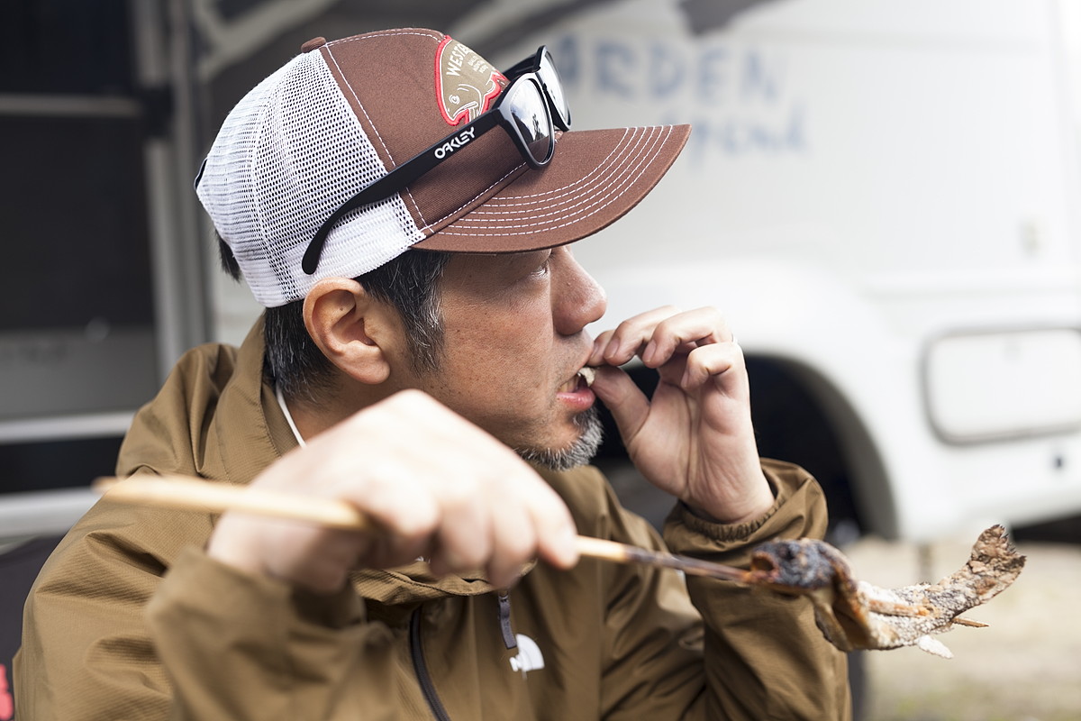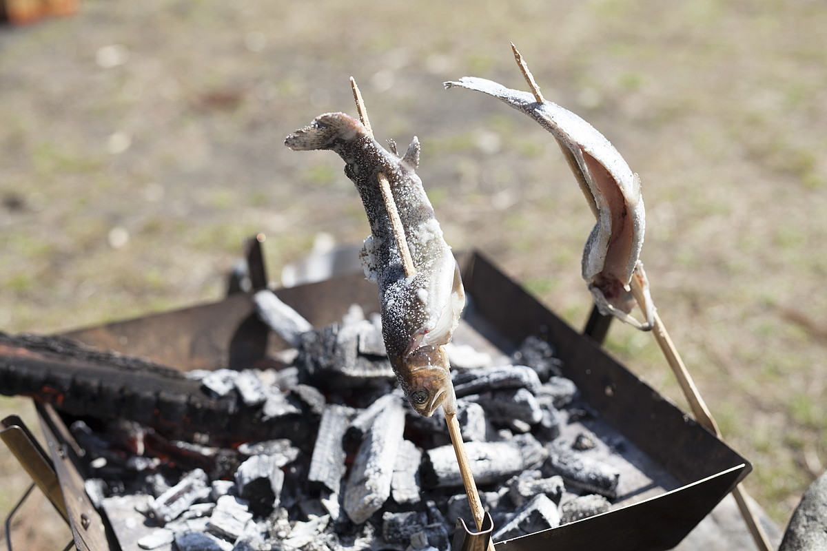 火の加減もちょうどいい。周りの山々を眺めながら2、30分ほど待つと、ほどよい焦げ目がつきはじめる。串を持ってがぶりっと食らいつくと、あつあつふわふわの身が美味しい!