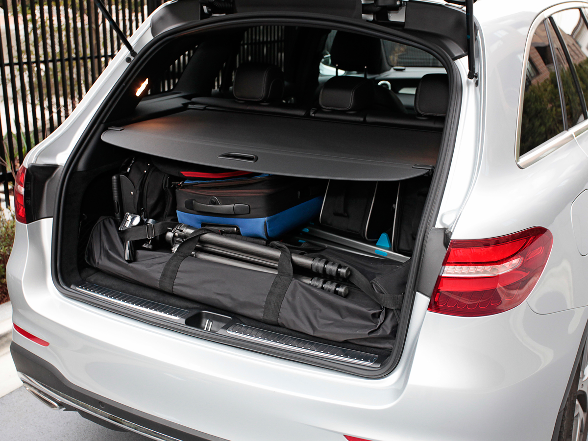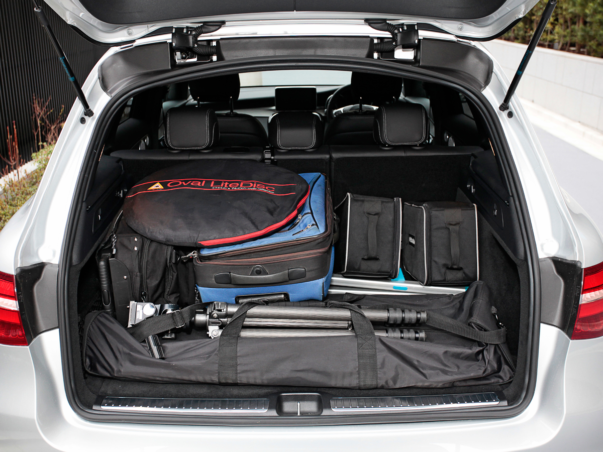 例えば、メルセデス・ベンツ「GLC」では、奥行き90cm、最大幅140cm…といっても、これはゲート手前のごく一部だけで、実用的な荷室幅は109cm。荷室カバーまでの高さは42cm。参考までに、GLCの搭載状態の写真を見ていただくと、F-PACEの余裕っぷりがお分かりいただけると思います。