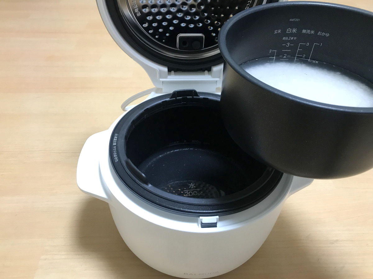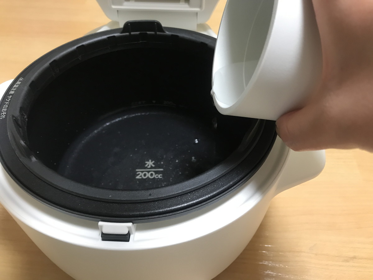 最初に付属の水計量カップで200mlの水を外釜に入れるという工程が入ります。この水が、のちに大きな違いを生むことになろうとは…。