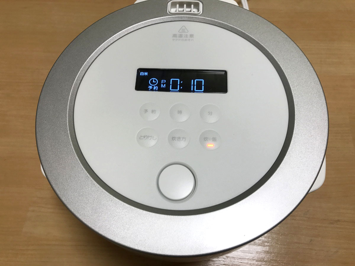 ▲蓋をして炊飯ボタンをポチッとな。操作はシンプルで、かつボタンが蓋の上についているため、筆者のように床に直置きして炊飯する人でも操作しやすい