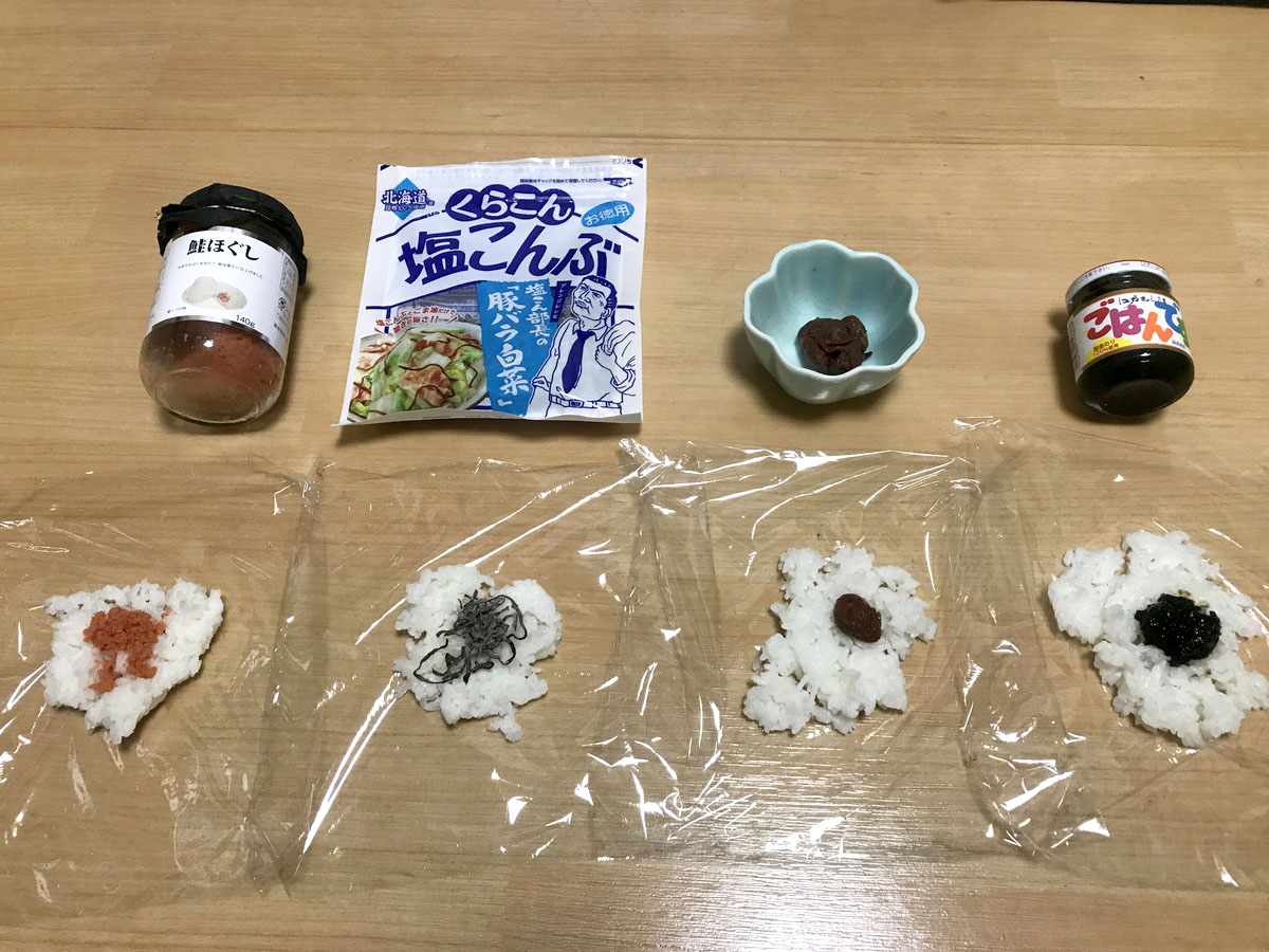▲左から鮭フレーク、塩昆布、梅干し、ごはんですよの4種類で比較