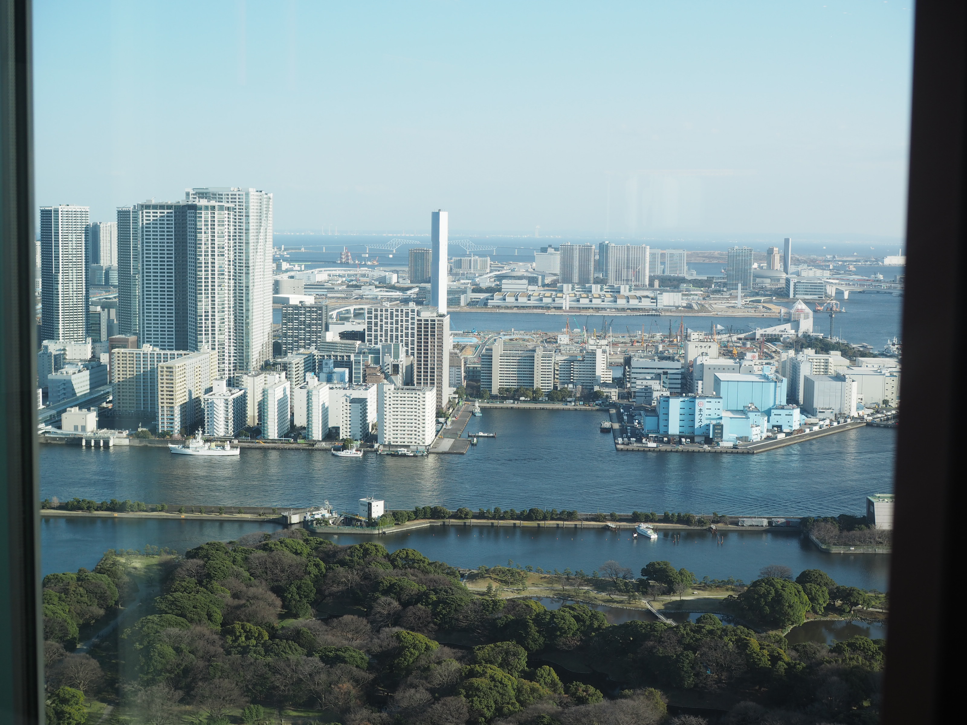 15時にチェックインしたら、部屋の窓からみえる景色を楽しんで。こちらは東京で数少ない、東京湾に面したベイビューのラグジュアリーホテル。できれば東京湾側のお部屋を予約するのがおすすめです。眼下には浜離宮恩賜公園が広がっていて、新緑の緑と海と空の対比が美しいです。