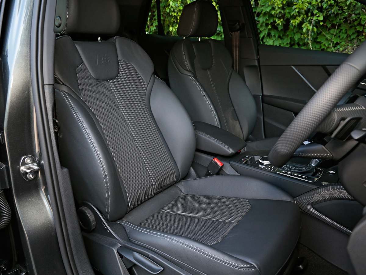 今回試乗できたのは、最上級の「1.4 TFSI シリンダー オン デマンド スポーツ」。正確には、「1st エディション」と呼ばれる、日本への輸入開始を記念した特別仕様車で、Sラインパッケージ(19万円)などで、スポーティなルックスに仕上がっています。例えば、スポーツバンパー、18インチのアルミホイールがおごられ、ドアを開ければ、Sラインのロゴがうれしいクロスとレザーのコンビネーションシートや、ステンレススチールフットペダルなどが待っています。
