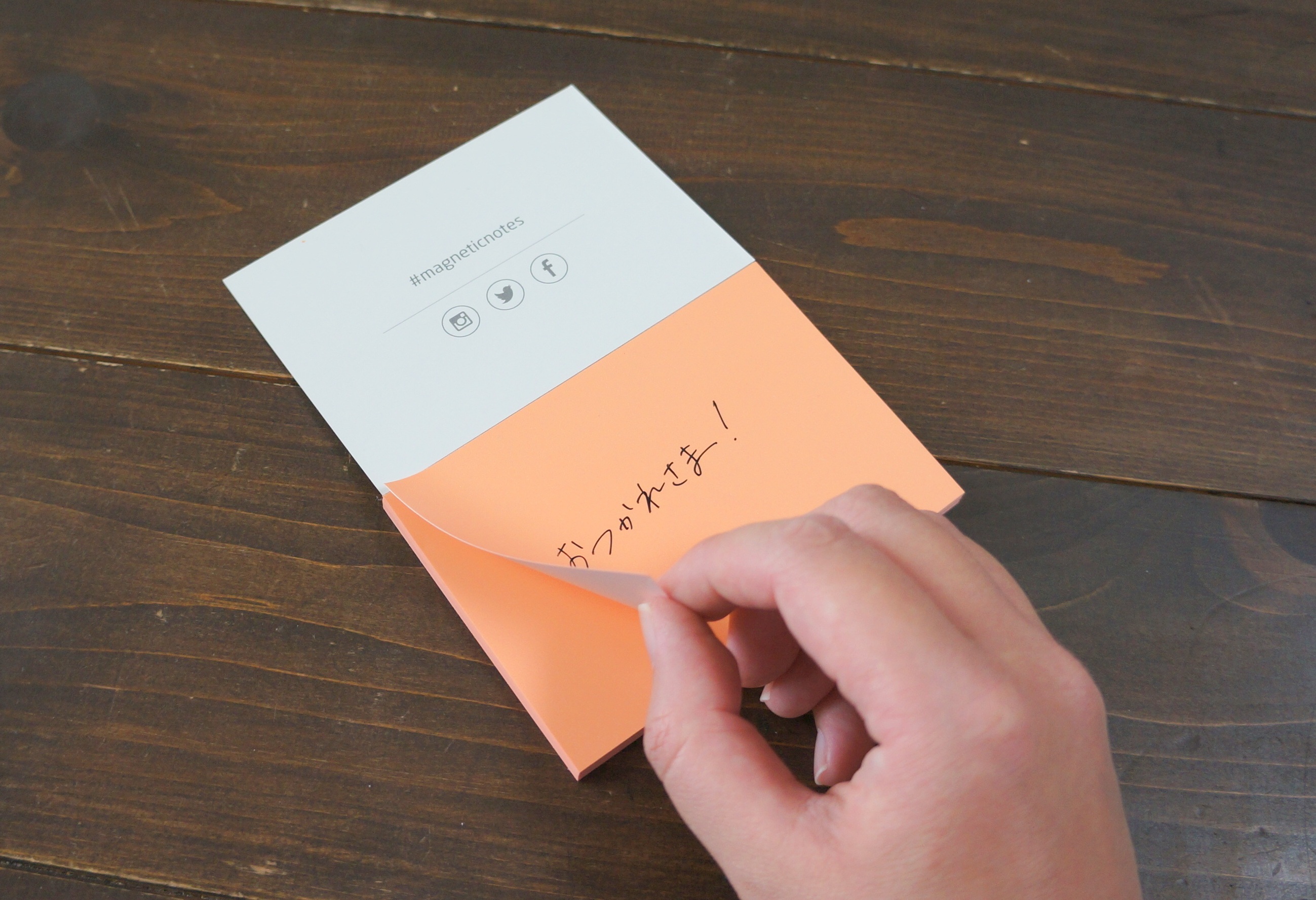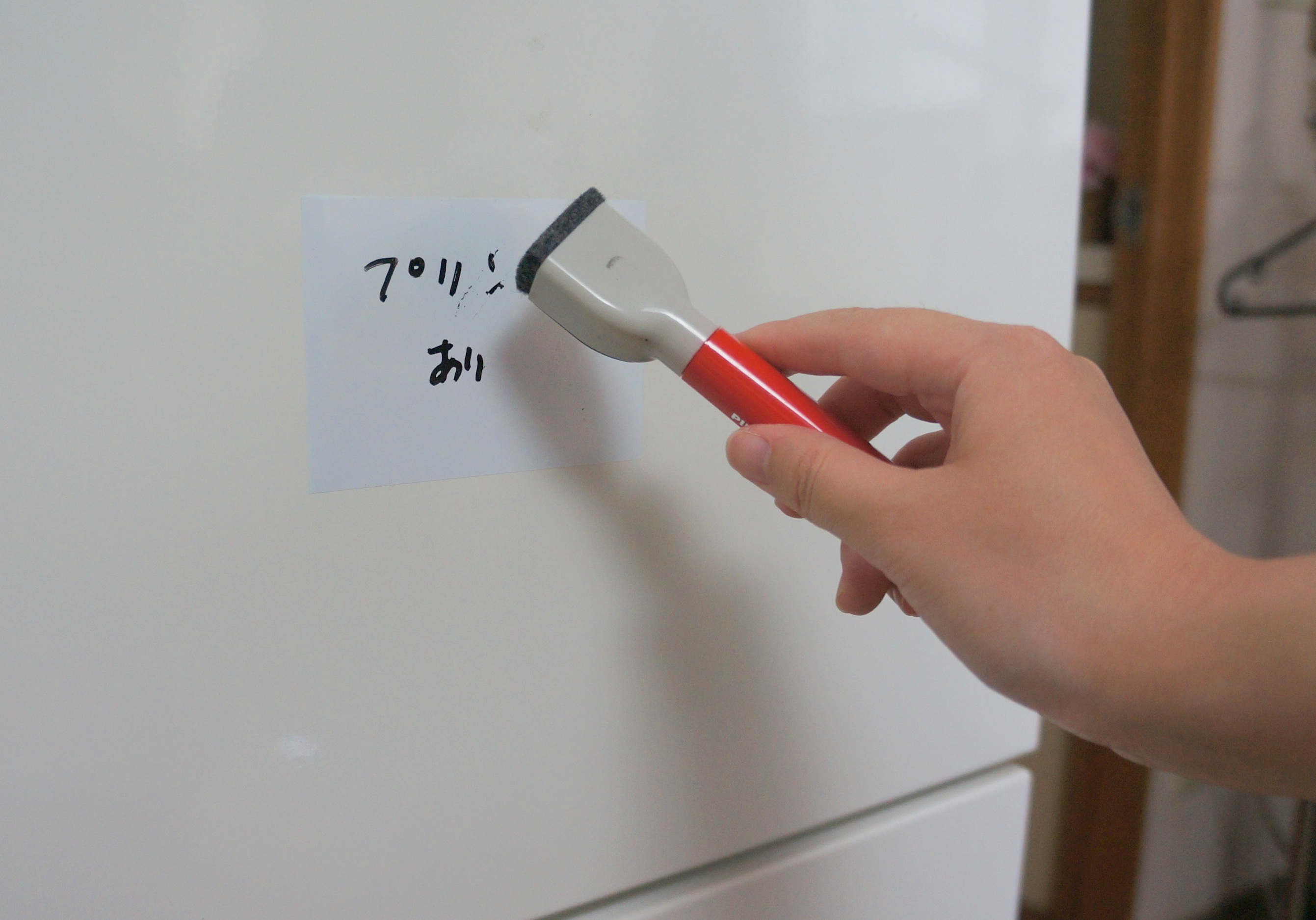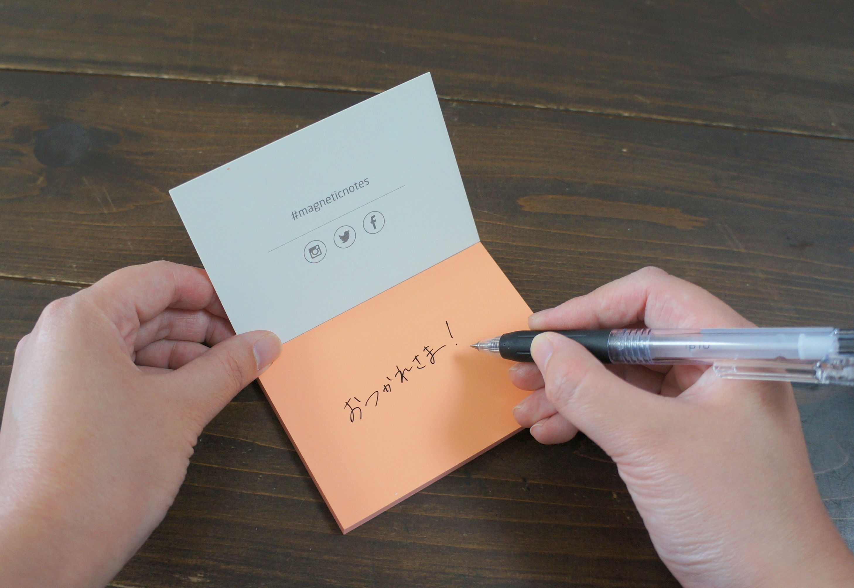 使い方は、「マグネティックノート」の裏面が“表”になるように貼り付け、ホワイトボード用のペンで書き込むだけ。書き込んだ文字はホワイトボード用のイレイザーで消せるので、冷蔵庫の扉や電話の近くにある壁に貼り付けて“伝言板”として利用できます。