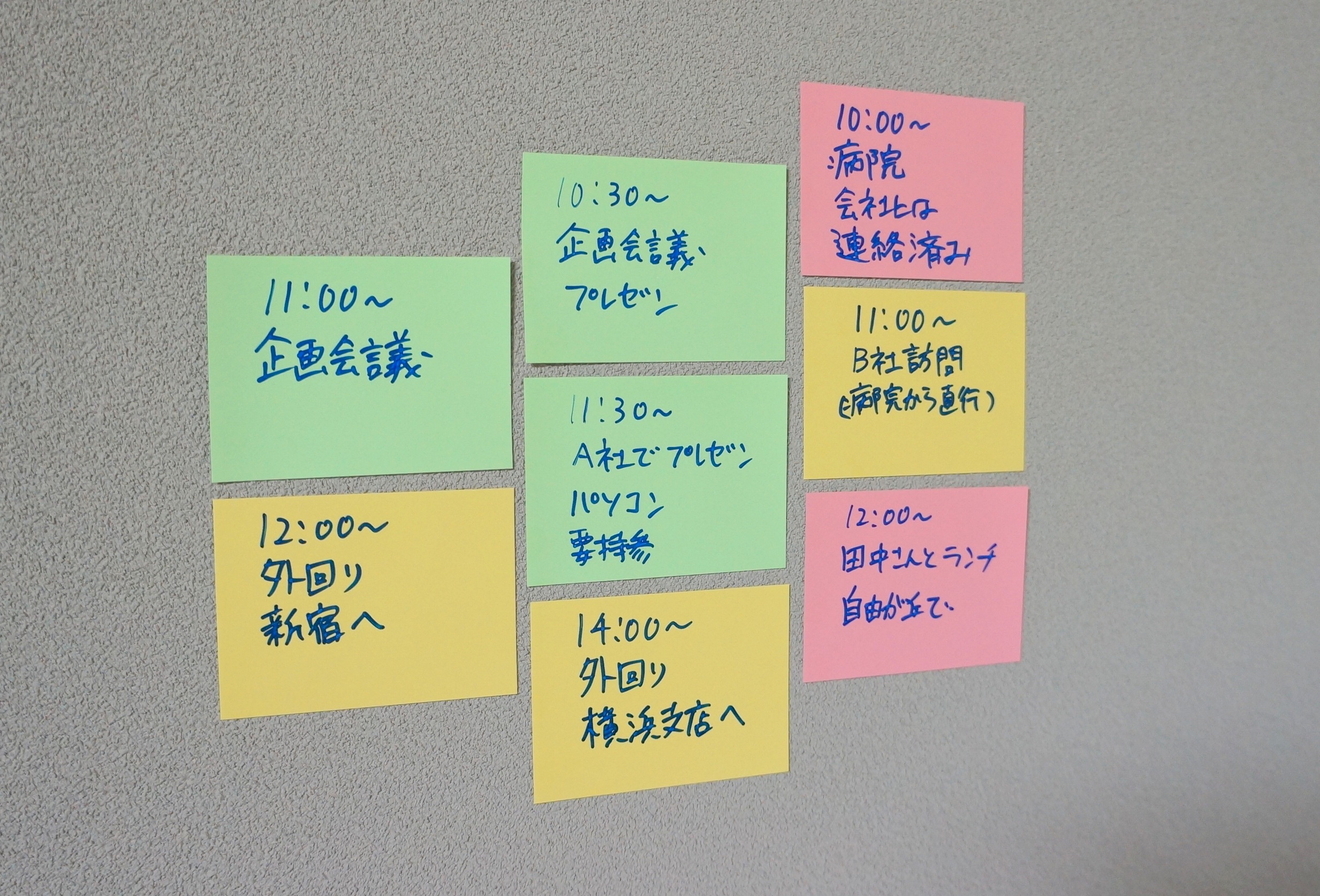 「マグネティックノート」の特徴は、 “普段ふせんを貼らないような場所”に使えること。デスク周りの壁に、その日やるべき仕事を書き出した「マグネティックノート」を貼れば、スケジュール管理に役立ちます。