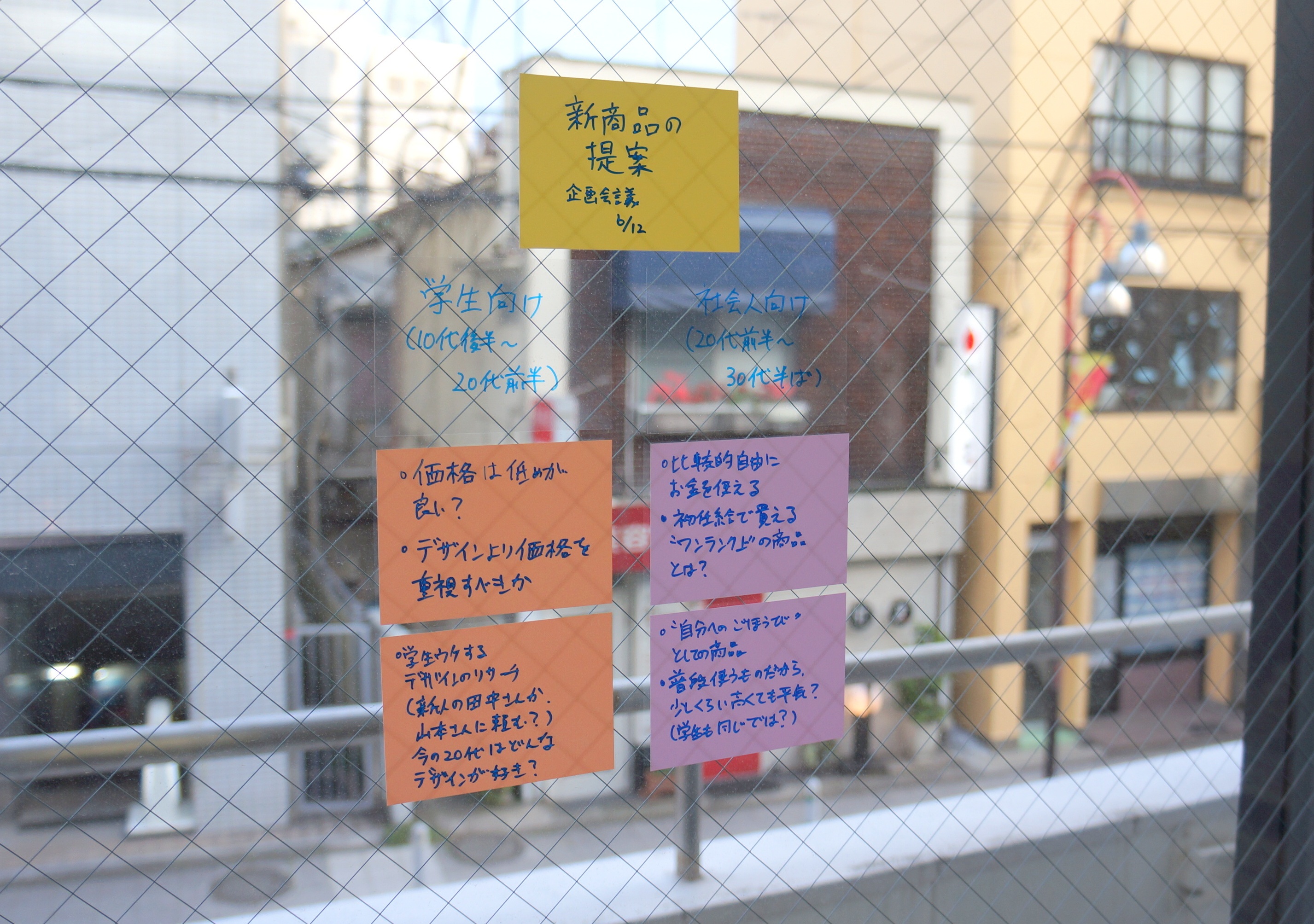 どこにでも"ペタッ”と貼り付けられる「マグネティックノート」は、企画会議などで参加者のアイデアを書き留める“アイデアカード”として利用できます。「マグネティックノート」を貼り付けて、窓や壁で皆のアイデアを一覧することも可能。