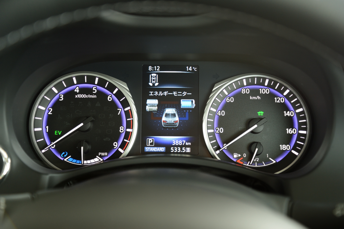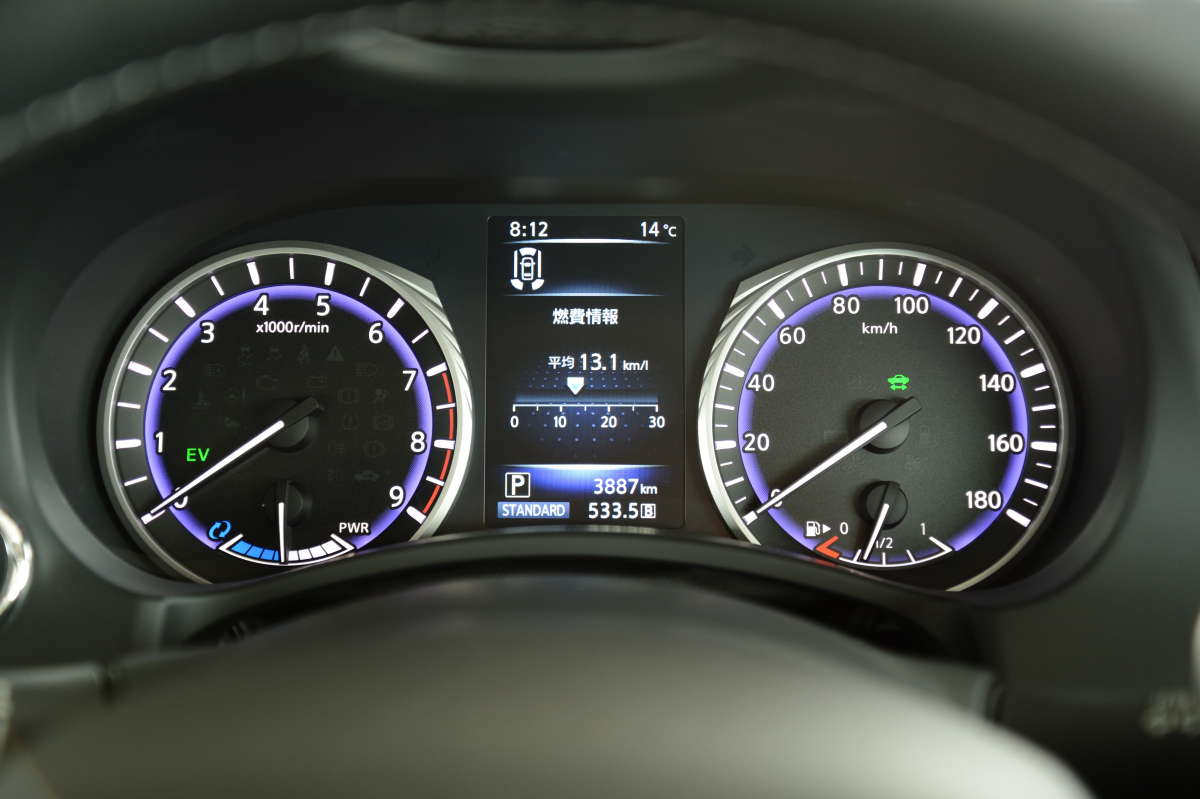 ハイブリッドと聞くと、どうしてもエコ最優先というイメージがありますが、スカイラインはモーターとエンジンの連携も実に秀逸で、音質やフィーリングの変化など、走りの高揚感を邪魔するような無粋な振る舞いを見せることはありません。また、シームレスかつ強力、抑揚の効いた加速感も、草食系のサルーンとは一線を画すスポーティさを感じさせます。