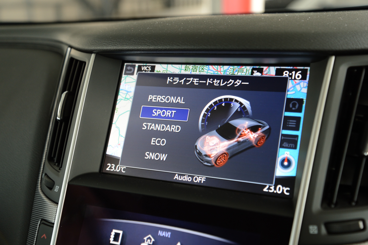 また、DASもスカイラインらしい挑戦だと思えば、十分に受け入れたくなるテクノロジーだと思います。通常モードでは“バイ・ワイヤ”です、といわれなければ気づかないステアリングフィールにも感心しますが、ドライブモードセレクターをスポーツに切り換えれば明らかにクイックな反応を体感できるのも、DASならではといえるでしょう。何より、このDASは、設定した速度をキープしながら先行車との車間距離を保つ“インテリジェントクルーズコントロール”、高速走行時の直進性を向上させる“アクティブレーンコントロール”と併用することで、わだちの多い高速道路でも自働的に制御され、ドライバーの負担を大きく軽減してくれます。つまり、グランドツアラーとしての本質に磨きを掛けようという、開発陣の意図が最も現れている装備かもしれません。
