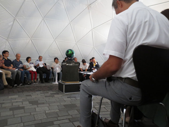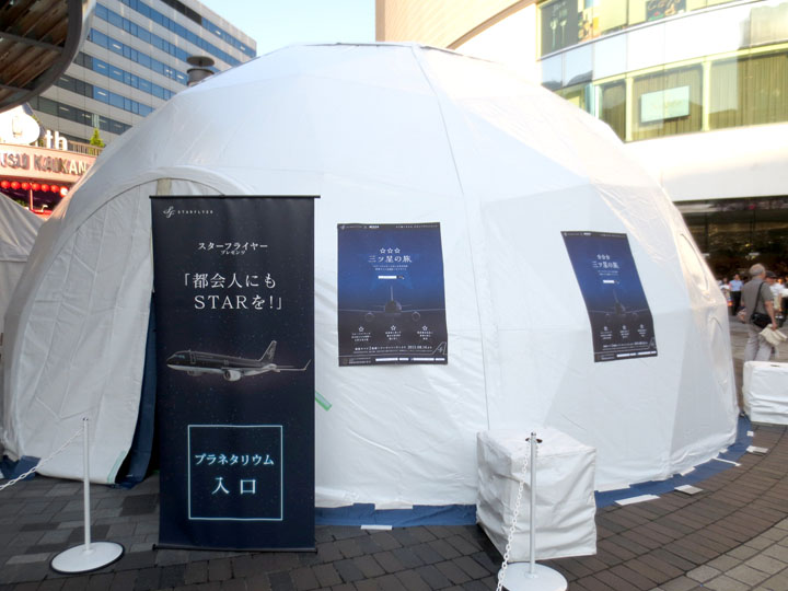 7月10日午後。前日までの雨がウソのような梅雨の晴れ間となったこの日、東京・有楽町駅の改札を出て駅前広場に向かうと、白いドームが目に飛び込んできました。駅から出てくる人も、駅に向かう人も、みんなが思わず目を留めるほどの違和感と存在感。これがKさんの言っていたプラネタリウム用のドームだなとすぐ分かりました。しかしまだ17時前。けっこう明るいのに、プラネタリウムなんてできるのかい。そう思いつつ、受付を済ませてドームの中へ。