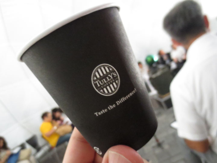 入場者に配られたアイスコーヒー。スターフライヤーの機内では、コーヒーショップ「タリーズ」と開発したオリジナルコーヒーが飲めます。このカップも、機内で出されるモノと同じ