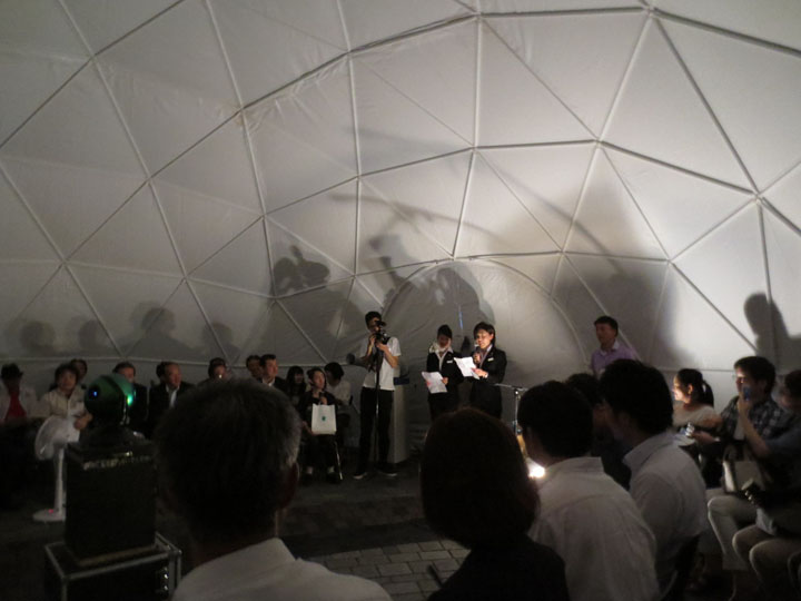 明かりを完全に落とす。意外にもドーム内は外の明るさを忘れさせるような暗さになり、イベントが始まりました。そして映し出されたのは、7月10日当日21時の北九州の空。なぜ北九州かって? それは、スターフライヤーの拠点だから。