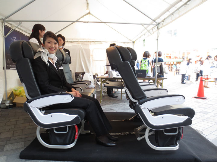 この日、プラネタリウム横のテントでは、実際に機内で使われているモノと同じシートが置かれ、誰でも自由に座れるようになっていました。こういうのって、思わず座りたくなりますよね。せっかくだからCAさんに座ってもらいました。小柄な女性がちゃんと座ったら、前の座席の下にあるフットレストに足が届かないぐらい余裕があります。