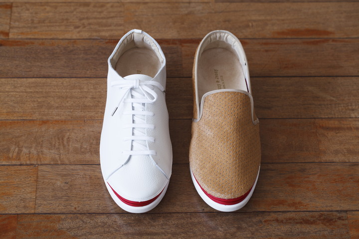二足並んだ靴。なんだか雰囲気は似ているけれど、でも違う靴に見えます。片方はシュリンクレザーのアッパーがオトナなイメージのレザースニーカー。もう片方は、軽やかな素材が夏っぽいパンチング加工されたアッパーのスリッポン。