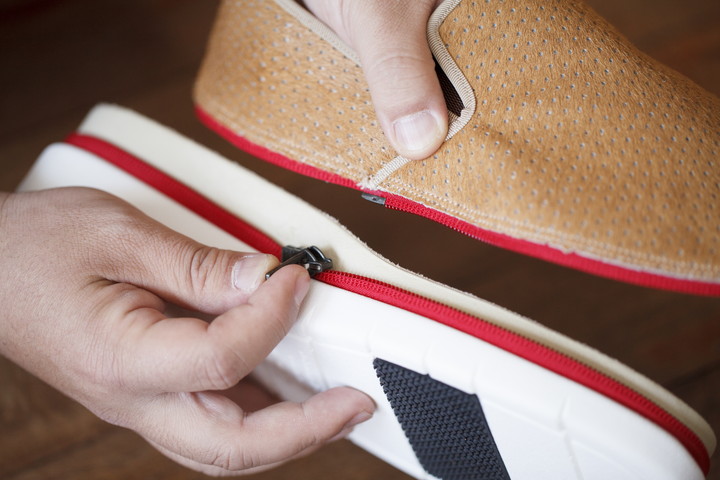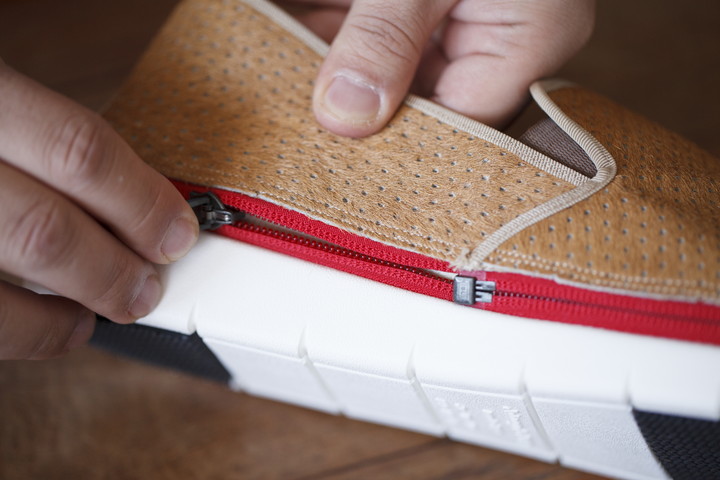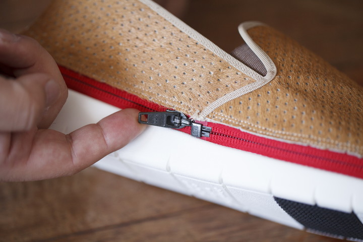 そもそも靴に掛かる負荷は、歩行時で体重の1.2~1.3倍といわれています。しかもその体重が上から下に掛かるだけでなく、時には横や斜めに掛かります。アッパーとソールが縫い付けられている通常の靴であれば、しっかりと縫製すればいいのですが、このキセカエシューズはアッパーとソールをつなげるものはファスナー。ここがしっかりしていないと話になりません。