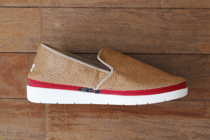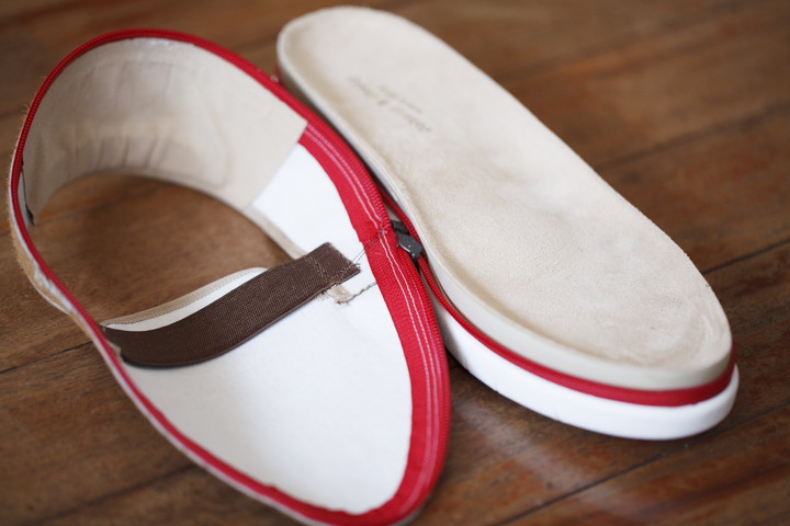 ここに長田の靴作りの技術が生きています。まるでソールの縁をトレースするかのように切り取られたアッパー。そのアッパーにゆがみなく縫い付けられるファスナー。すべて手作業で行われるこれらの工程により完成した、上下で狂いのないファスナー形状が、しっかりと噛み合い、靴に掛かる負荷に耐えるのです。