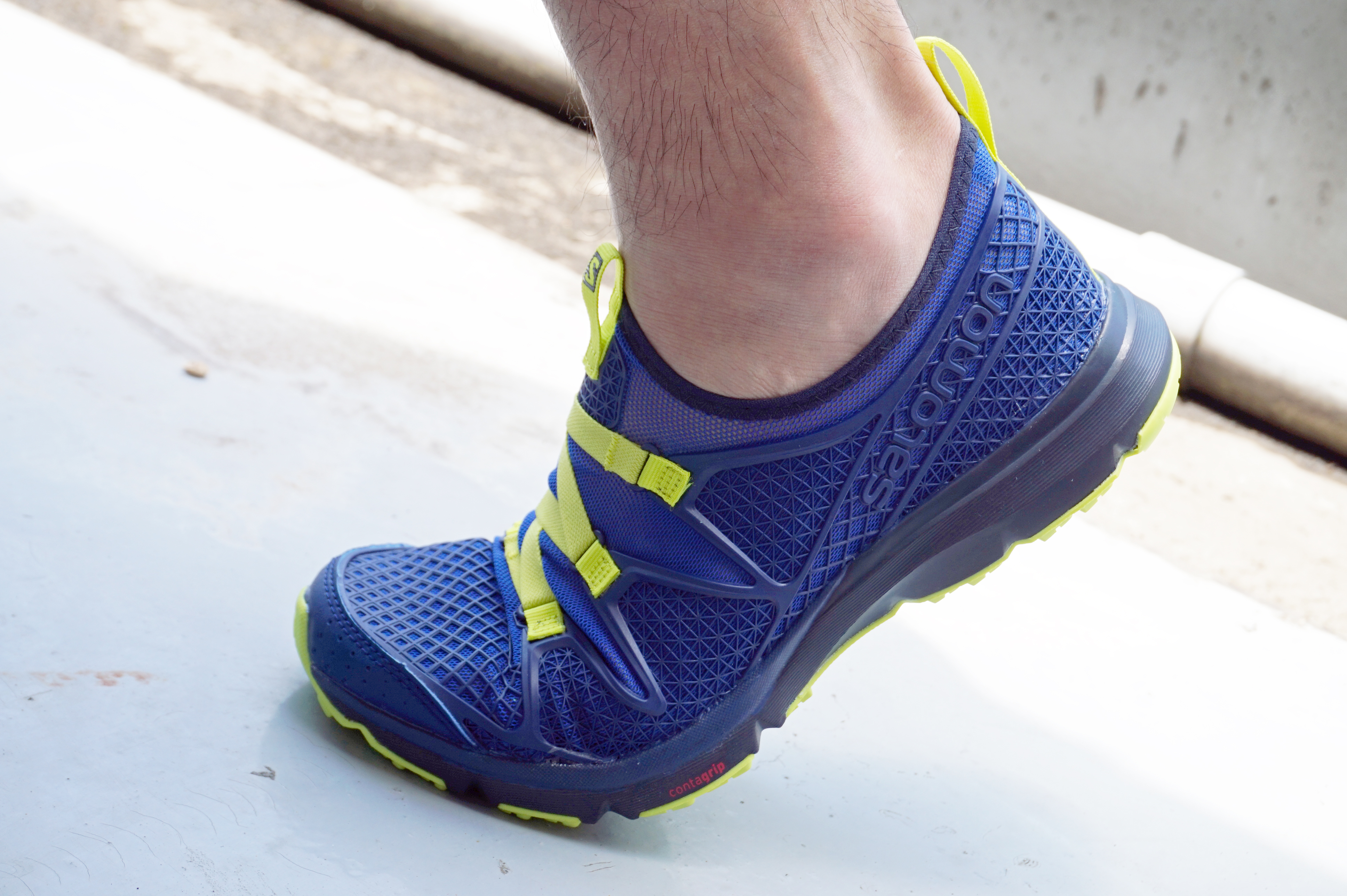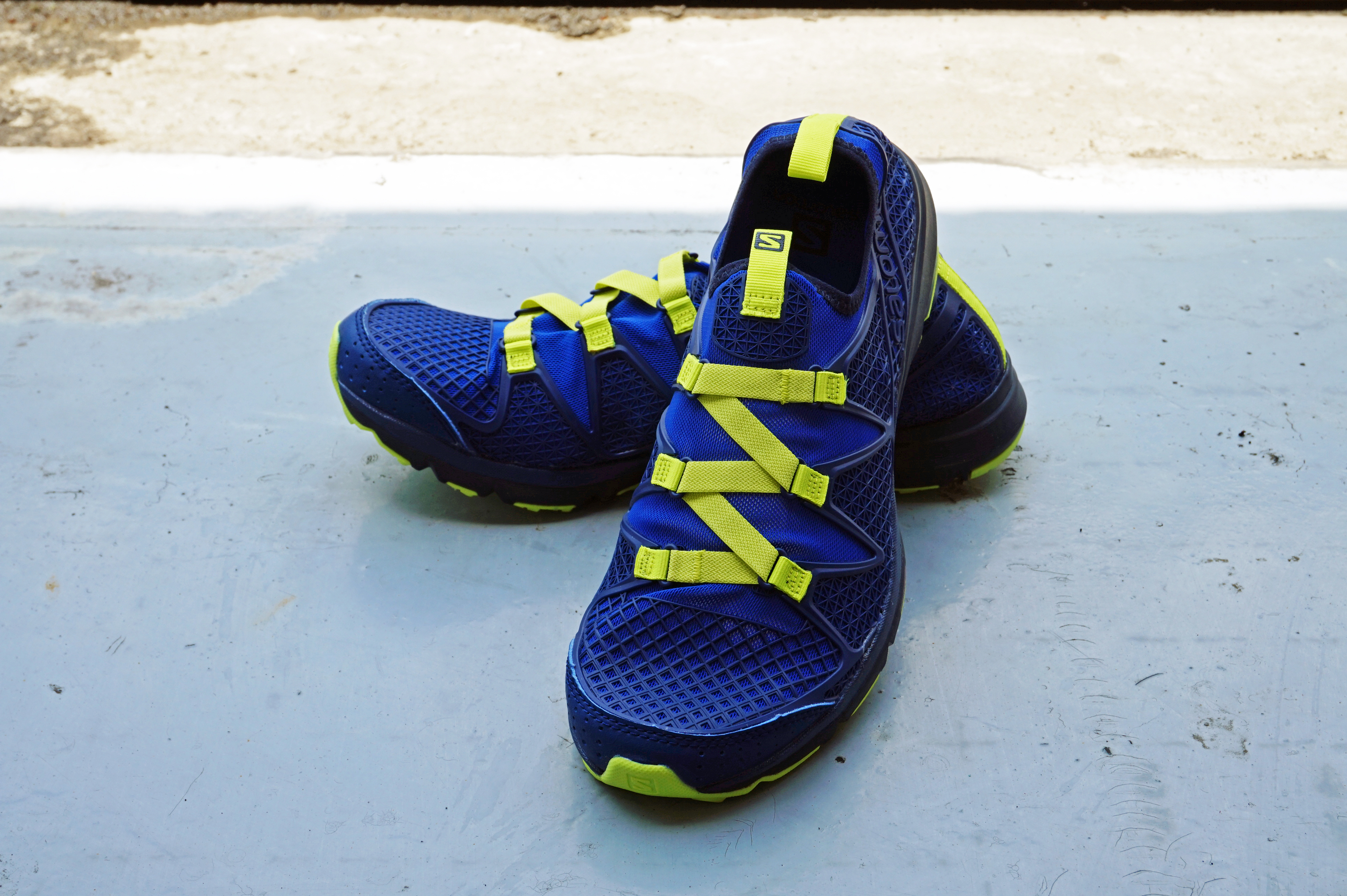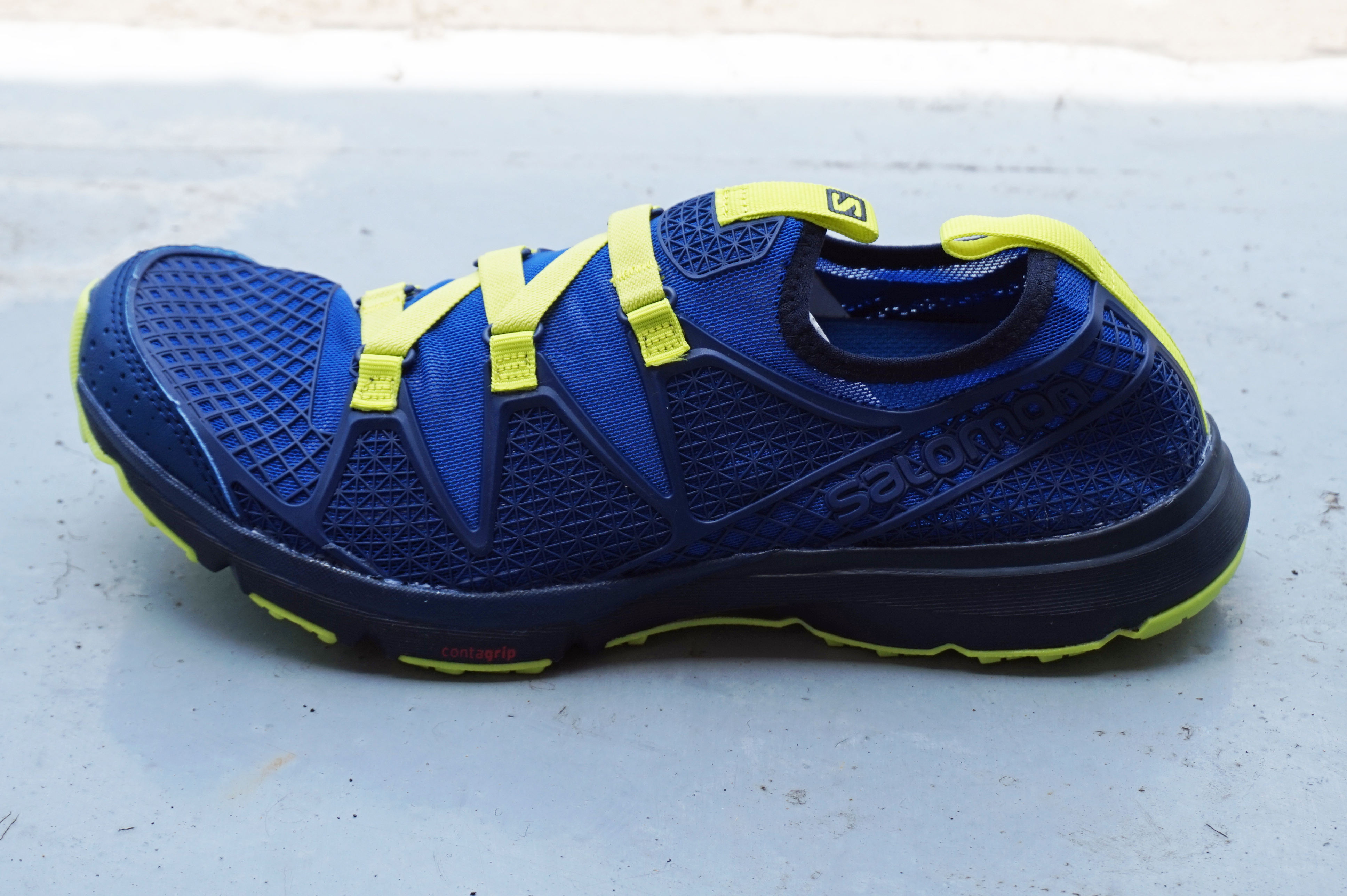サロモンの水陸両用シューズは、ストレッチ性と排水性に優れたメッシュ素材を使用したスリッポンタイプ。素足でも使えるつくりなので、シュータンがなく履きやすいうえ、ソックスのようなフィット感があります。そうまさに、水に濡れてもすぐに乾く、少し厚めのソックスを履いているような感じです。