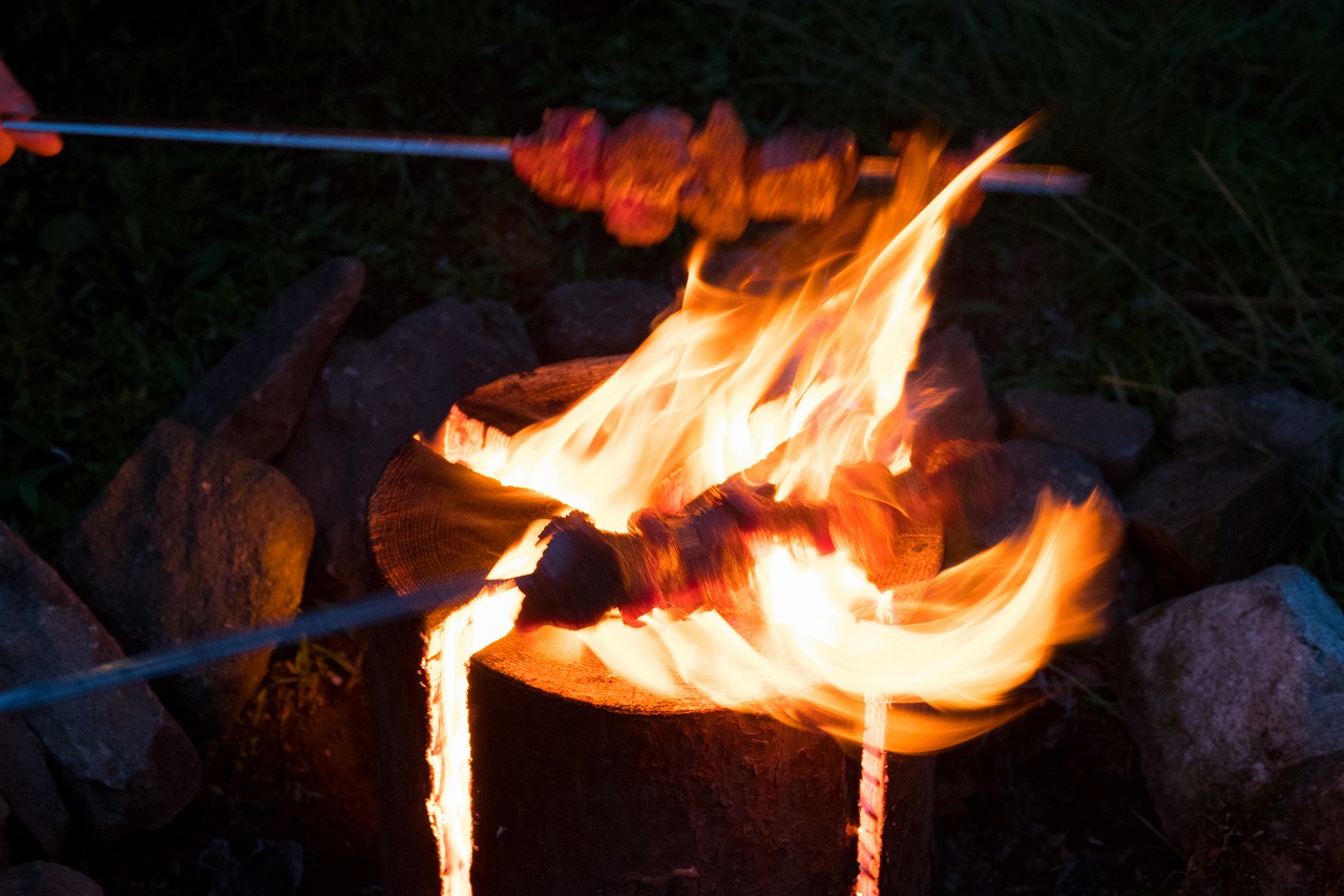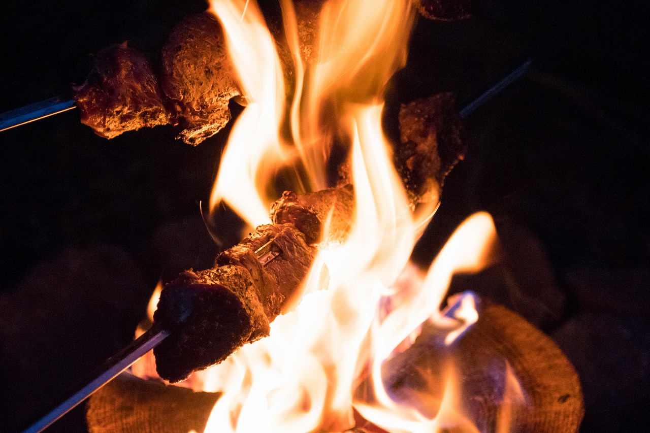 持参した羊肉を金串に刺して直火で焼いてみました。トーチ自体の高さがあるため、椅子に座りながらの調理がしやすいです。