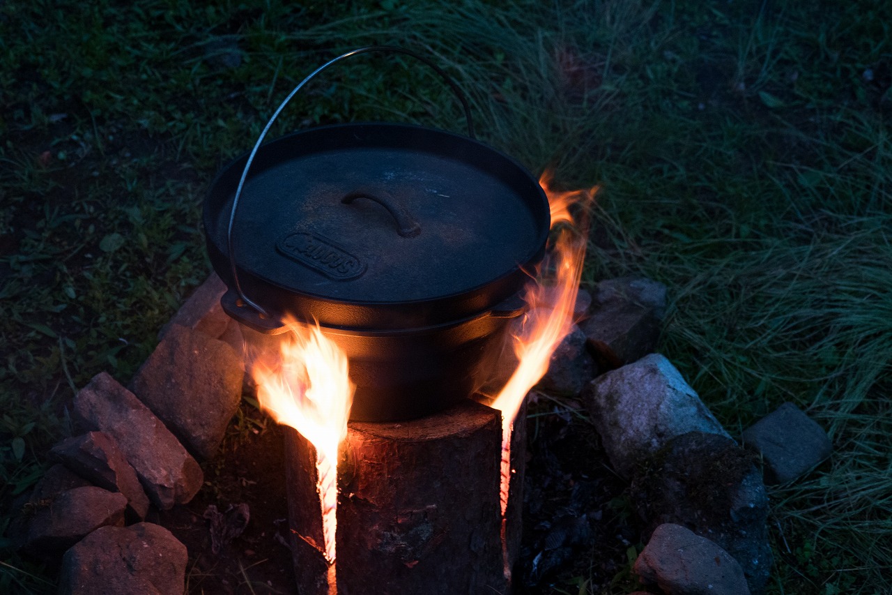 丸太の上が平らになっているため、鍋やフライパン、ダッチオープンなどを載せられるのも便利な点。調理道具を置くと中心部の火勢はやや衰えますが、脇の切れ込み部分から火が立ち上るため問題ありません。ただし、こうした使い方は燃え始めのころに留めておくのがいいでしょう。ある程度、燃焼が進むと崩れやすくなるためです。