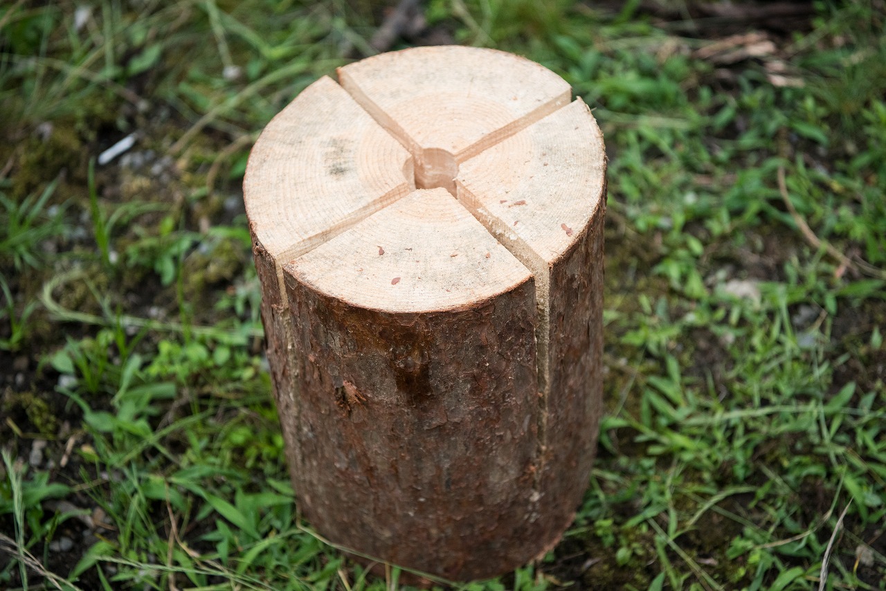 ②チェーンソーで丸太に十字の切れ込みを入れる