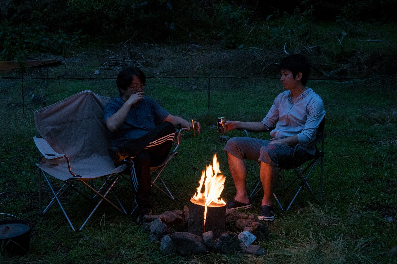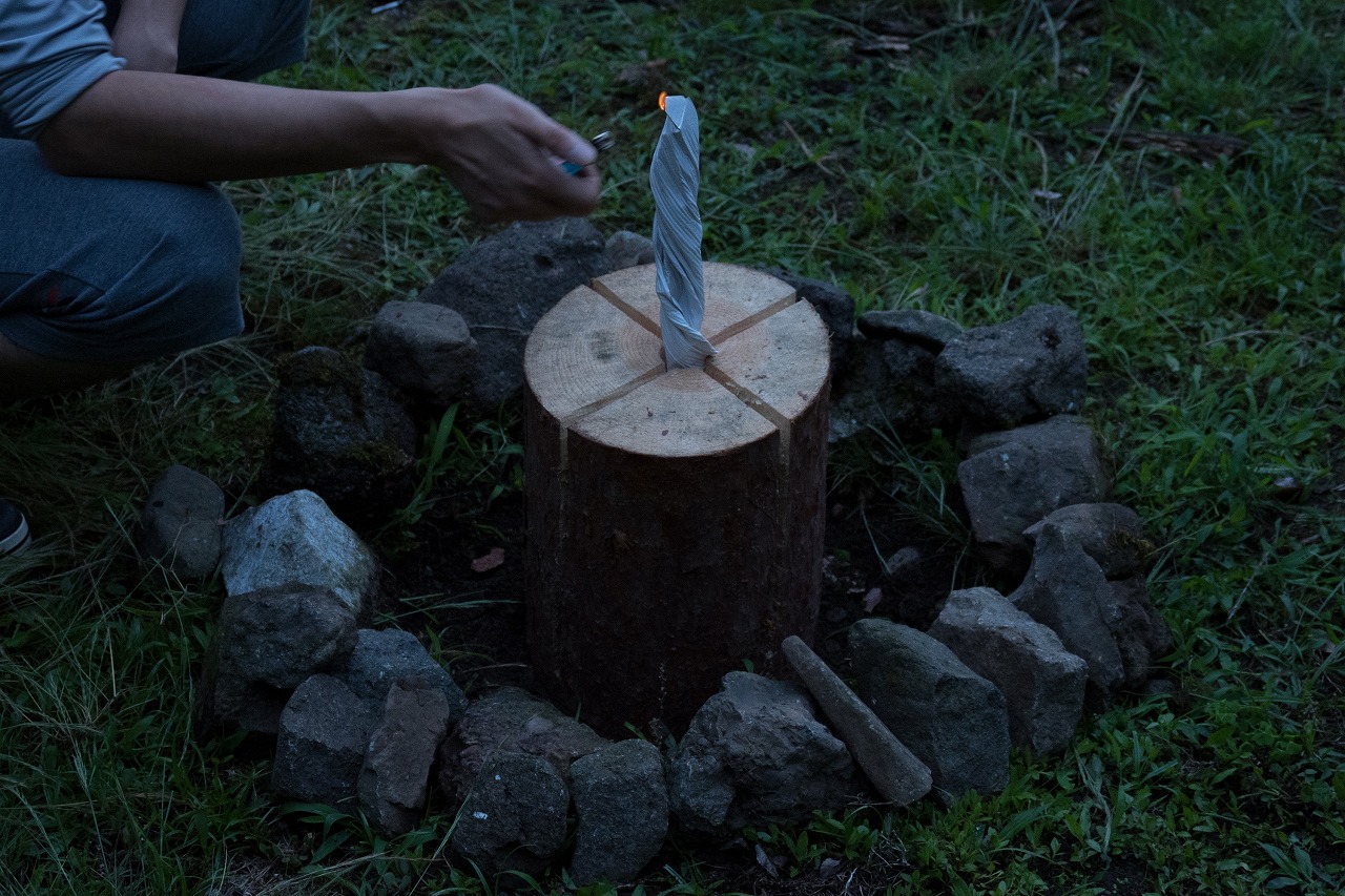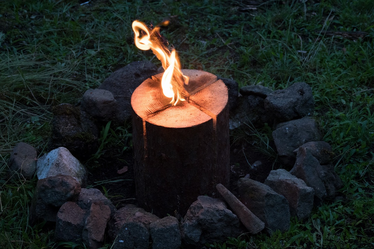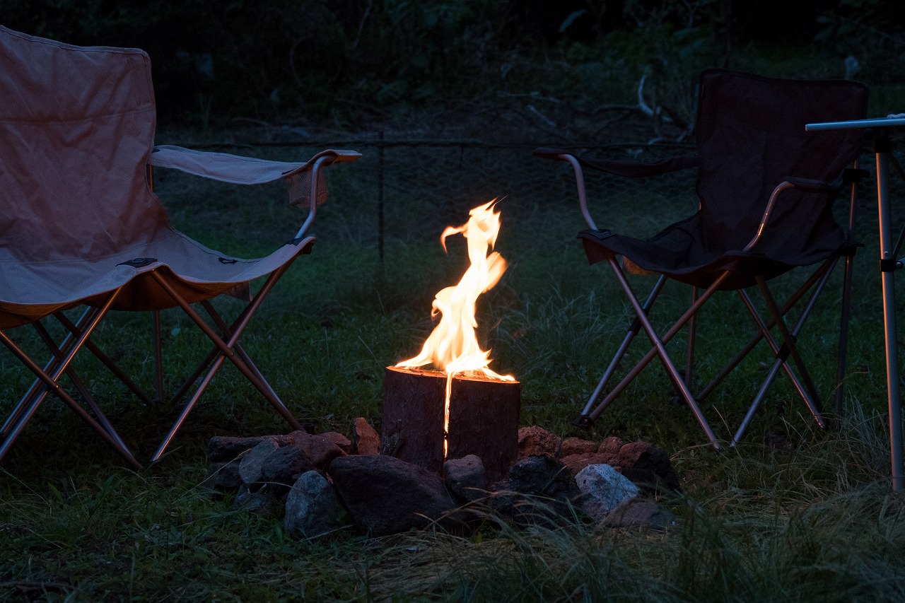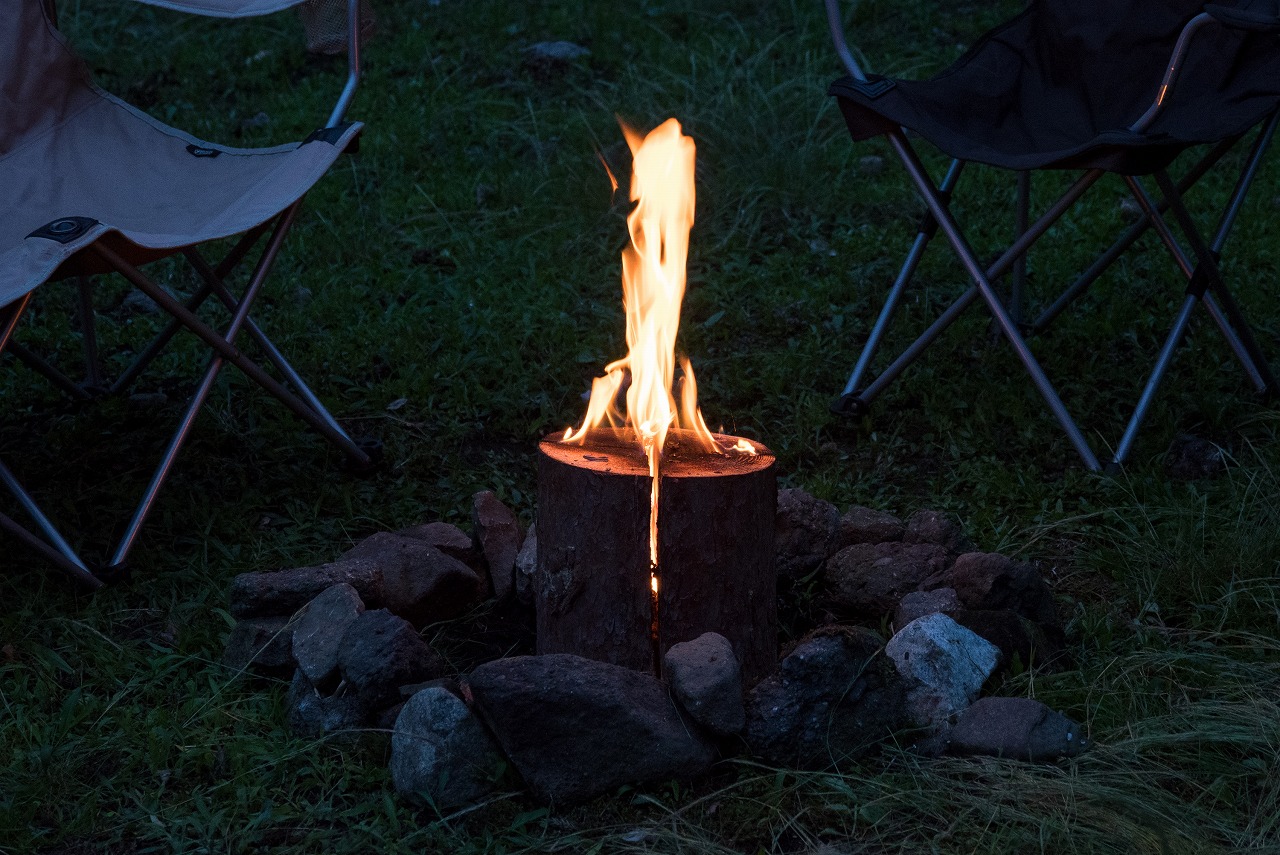 さて、そんな重いスウェーデン・トーチを持ち込んだのは山梨県某所にあるキャンプ場。安全性を考慮して石で囲いをつくり、消火用の水を用意したうえで、暗くなるのを待つこと1時間。