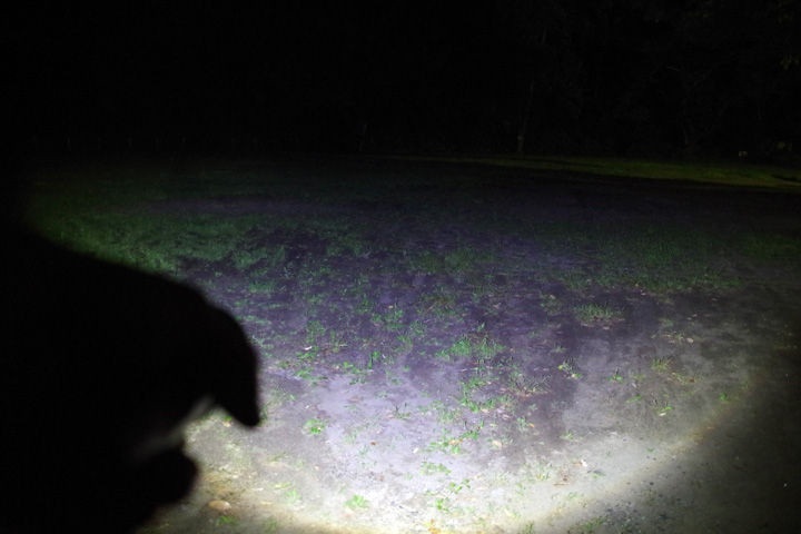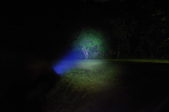 最スポットでは40m付近の木を全体的に照らすことができました。当日は雨上がりということもあり空気中の水分を媒介として美しい青い光軸を見ることが出来ました。近年のLED LENSERのハイルーメンモデルは、どれもさほど極端な集光性を重視していません。実用的な範囲での絞り具合でした。ヘッドの可動具合を見るともっと飛びそうですが、残念ながらそのようにはなりませんでした。