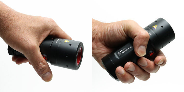 しかし、T14のスイッチボタンは外側に向かって凸っております。スイッチを完全に押し切るには少々硬いスイッチですが、半押しでのタップではセンシティブに反応します。そのため、必ずしも親指で押さなくともただライトをガッチリ握るだけで点灯させることができるようです。