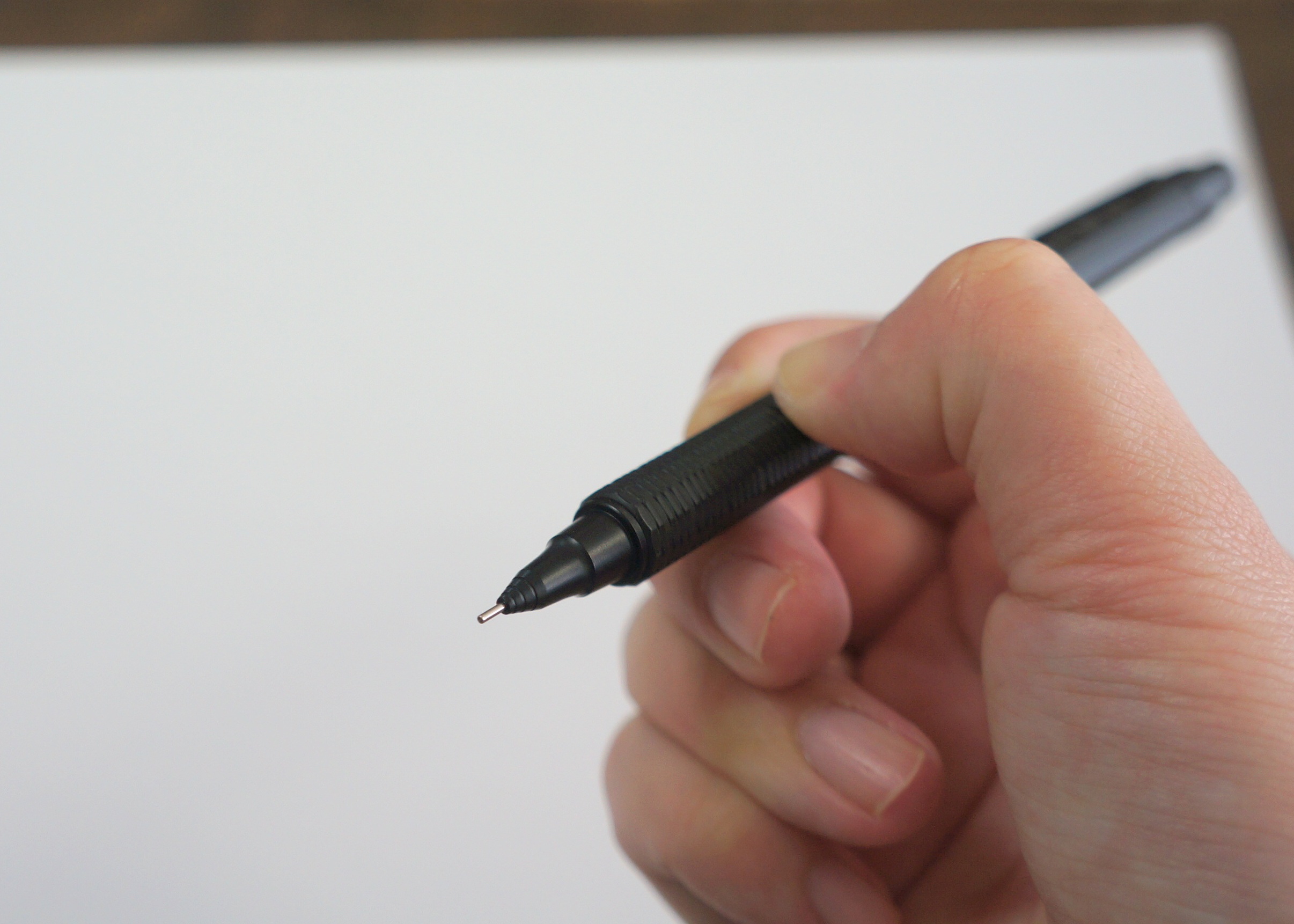 芯が出てきたら、ペン尻を押しながらペン先を紙面に軽く押し当て、パイプを引っ込ませます。