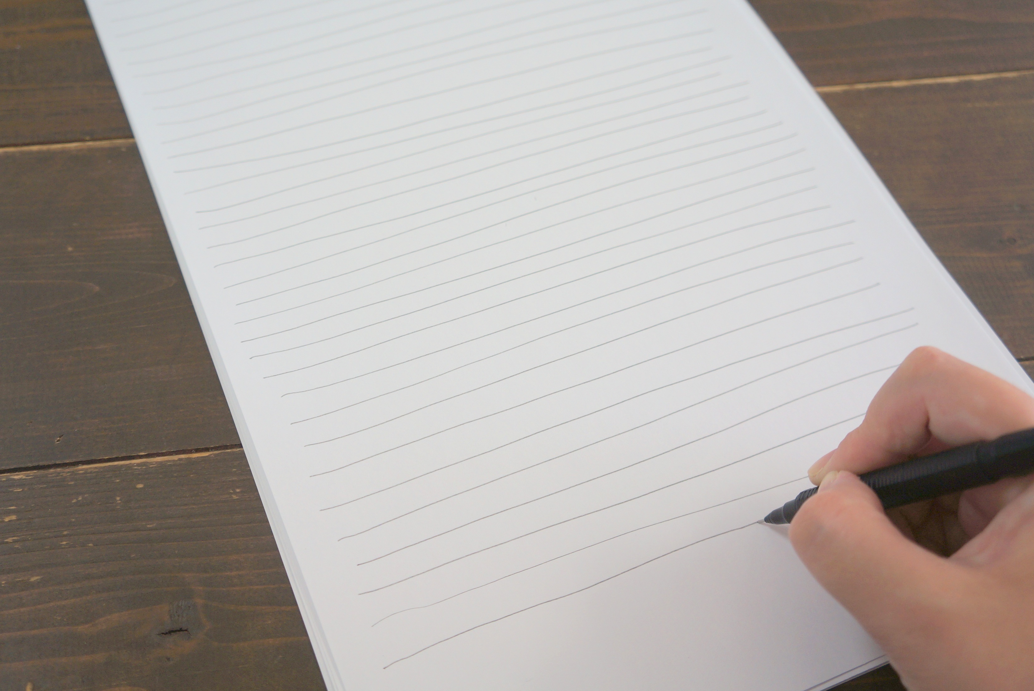 問題なく書けました。さらに、そのまま直線を書いても、筆記は持続可能。1度もノックする必要がありませんでした。筆記をやめるときは、再度ペン尻をノックしてパイプを引っ込めます。2回目以降の筆記では、1回ノックするだけで文字を書き続けられますよ。