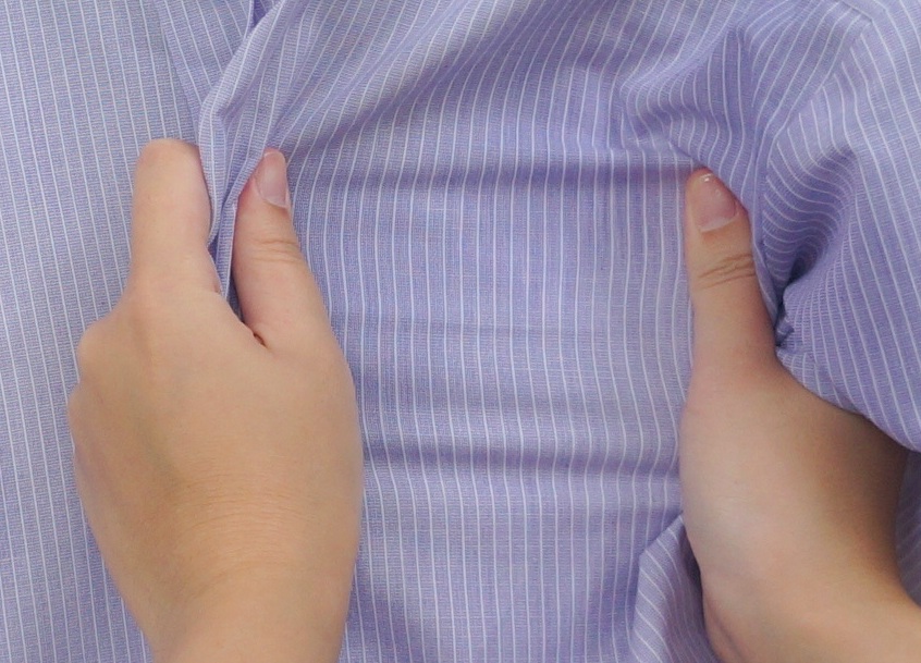次に、シワが付いている部分を、両手で縦・横・斜めに引っ張ります。結果待ちの段階ですが、このひと手間は確かに効果がありそうです。