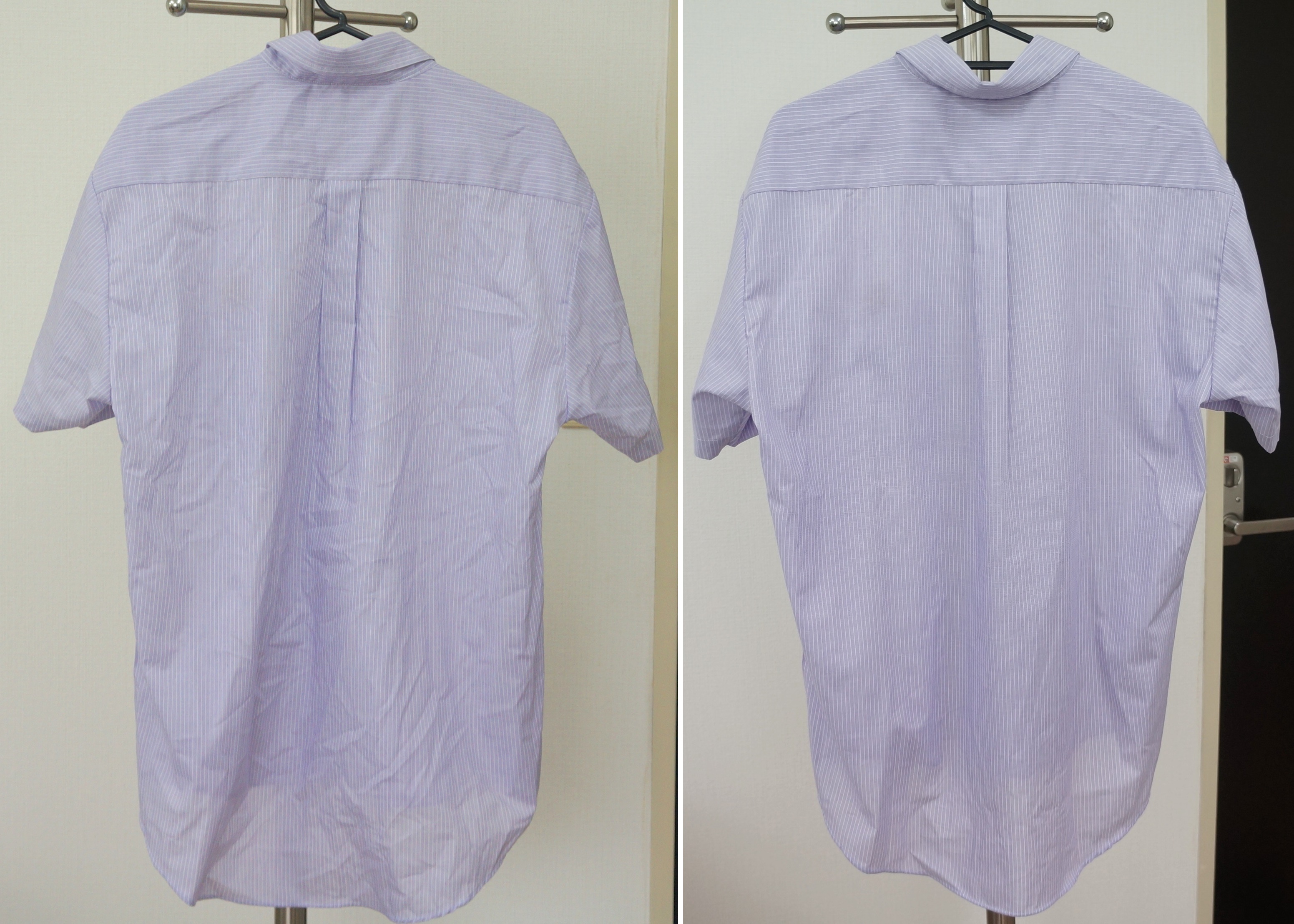 あとは、ハンガーにかけたままスプレーが乾くまで待ちましょう。今回は、“朝の忙しい時間にスプレーした”という状況を想定し、30分ほど経った様子を紹介します。この段階だとシャツに湿り気が少し残っていました。しかし、左のスプレー前の写真と比べると、シワが随分落ち着いたことがわかります。