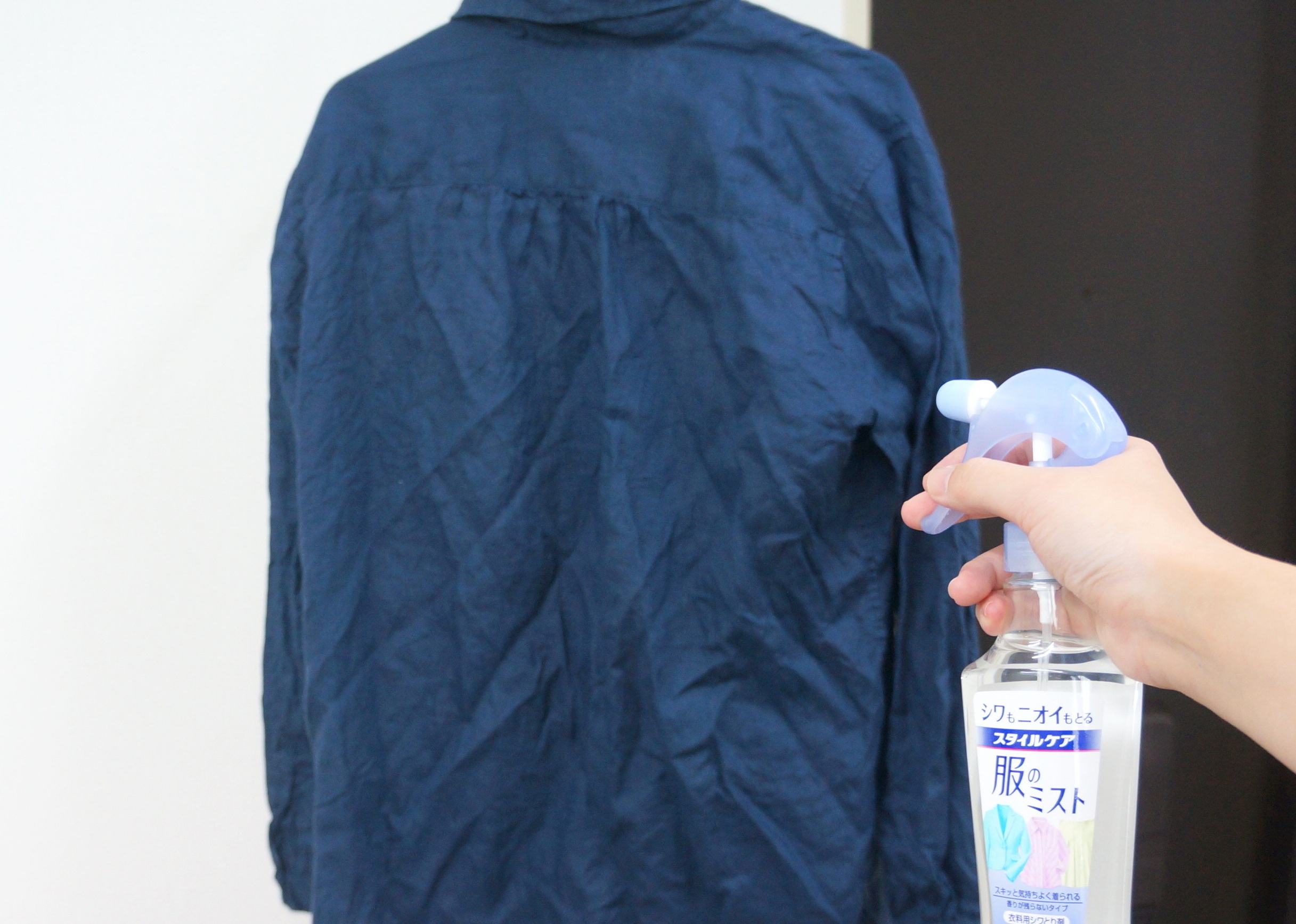 まずは、シワを取りたい衣服をハンガーにかけ、20cmほど離れた位置から「お洋服のスタイルガード」を生地が少し湿る程度に吹きかけます。なおこのシャツは、洗濯後に乾かしてからしばらく経ったもの。洗濯時のシワに加え、たたみ方がまずかったために生じたシワが所々にあります。