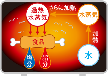 高温(200~300℃程度)に加熱した過熱水蒸気で焼きあげるウォーターヒート技術を採用している