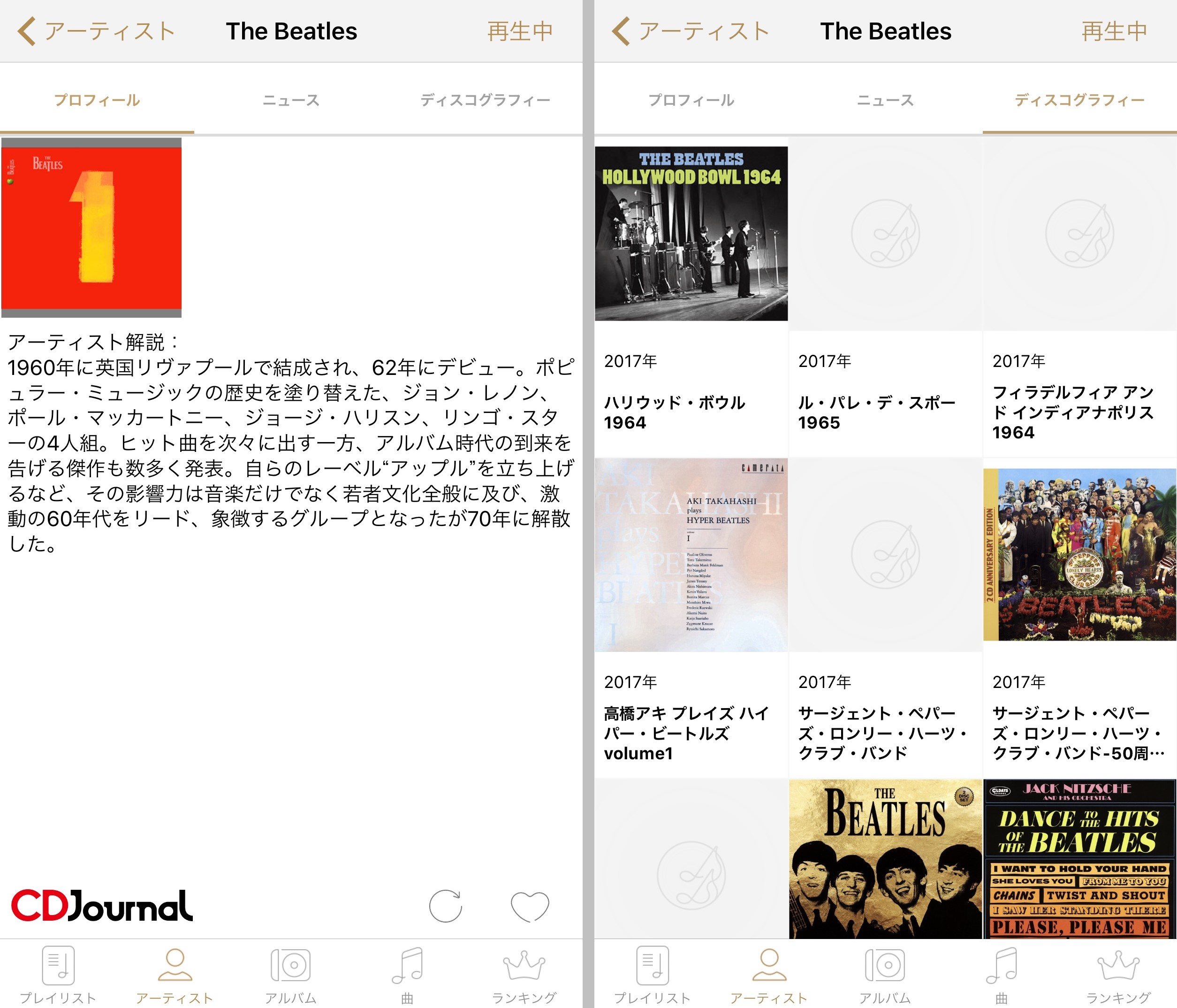 アーティストのプロフィールやニュース、ディスコグラフィーを読んで楽しむこともできます。