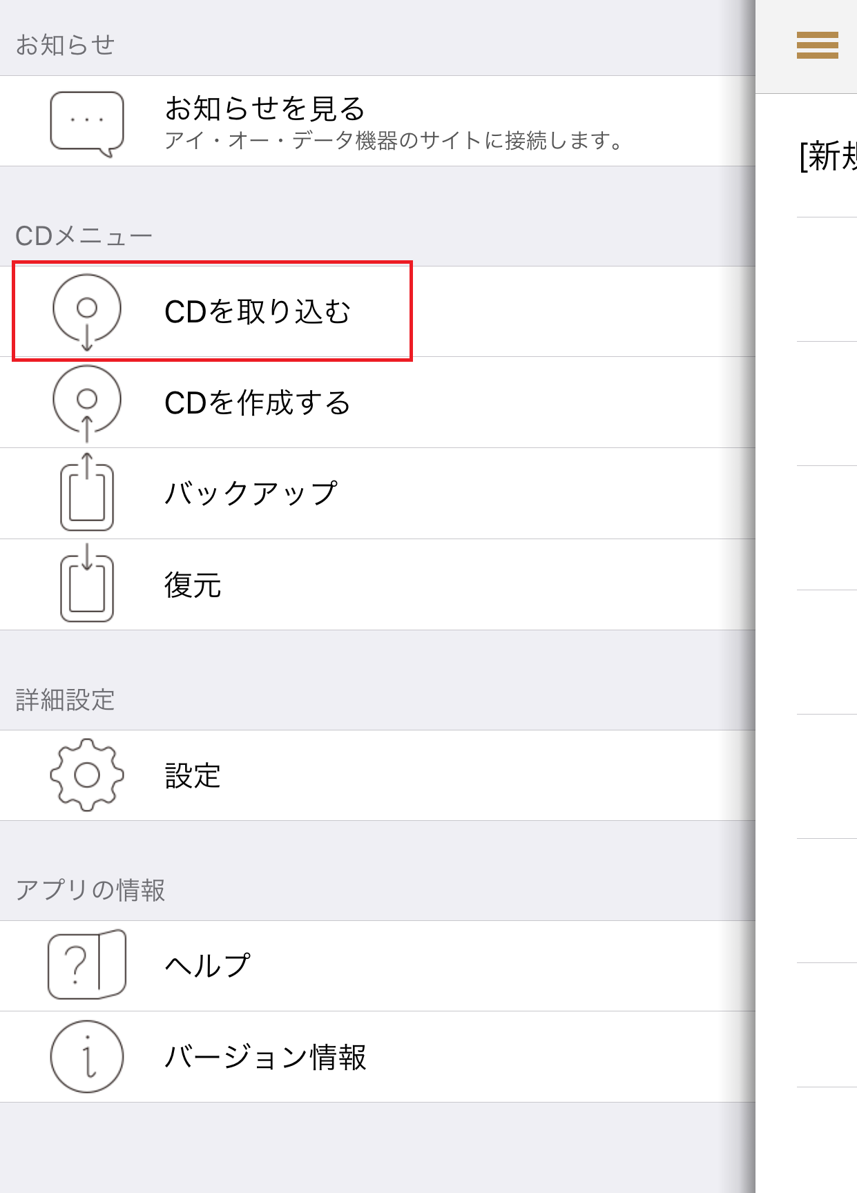 まずは画面左上のメニューアイコンをタップし、「CDを取り込む」をタップします。