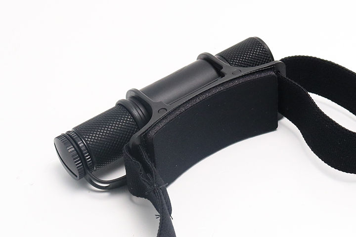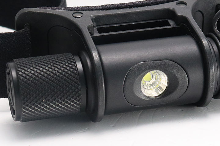 ヘッドライト本体は樹脂製の台座にホールドされます。適度なテンションのため、照射の向きを自由に変えられます。本体もほぼ円筒形のため、走ったりしても勝手に角度が変わってしまう可能性は低いでしょう。ボディ左側のローレット部分は本体と一体形成で空回りすることがないので、ここをつまんで本体角度を調整するような形になります。左手は本体角度の調整、右手は明るさの調整と覚えておけば混乱は少ないかと。