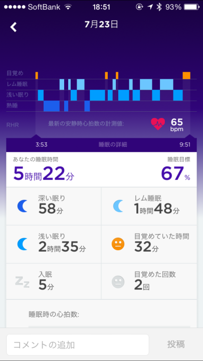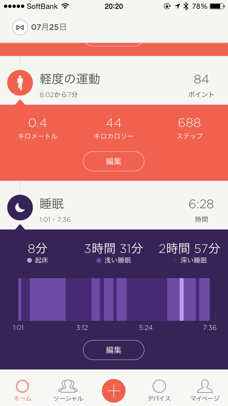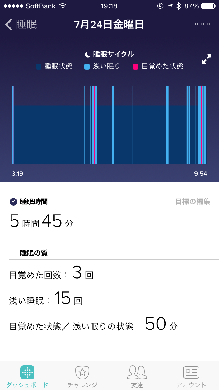 食後にちょっとうたた寝したときなども記録されてしまうほどに正確。睡眠モードに切り替える必要がないので、気づいたら朝まで寝ていた……というときも記録が取れるので心強いです。