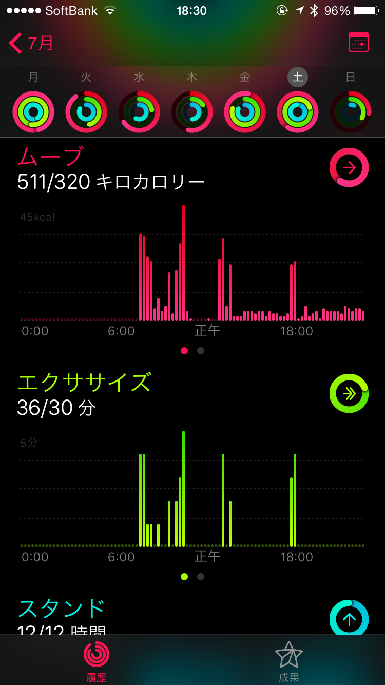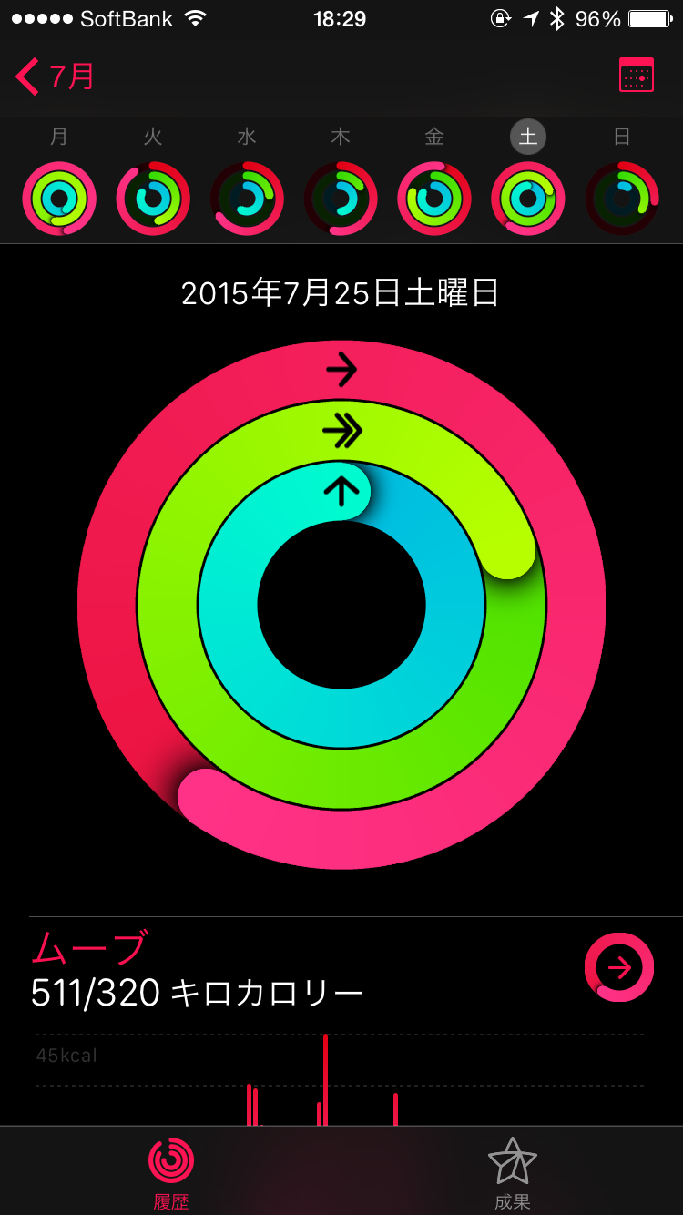 一日の消費カロリーである「ムーブ」は赤、グリーンは早歩き以上の運動をした「エクササイズ」の時間、青は席から立ち上がった「スタンド」の頻度です。