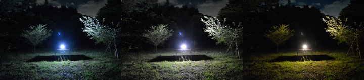 最後に、同じ場所で最大照度にした状態で撮影したものを比べてみました。撮影したカメラの設定はすべて<ISO6400、シャッタースピード1/2、絞りF3.5>です。