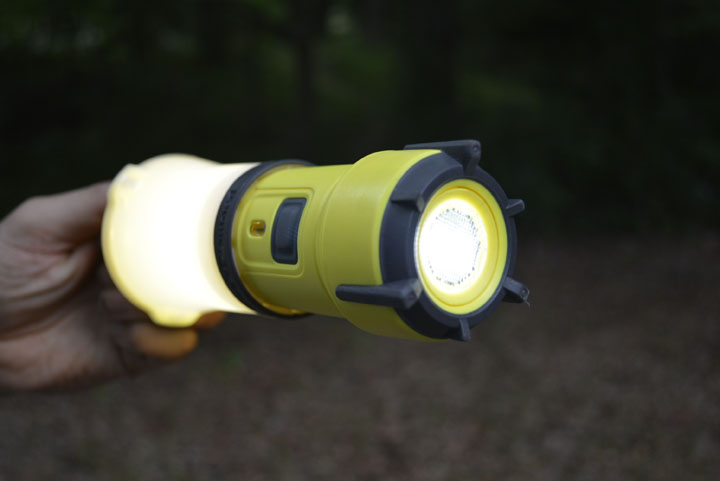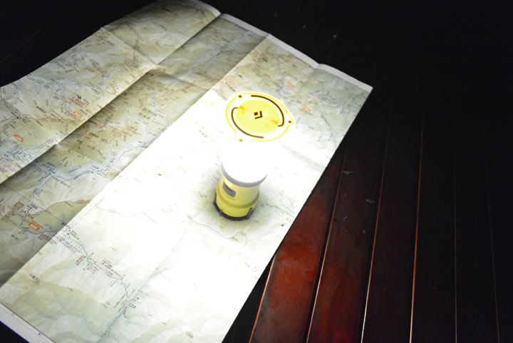 ランタンとフラッシュライトを両方点灯させることも可能。テント内で上から吊るし、全体を照らしつつ手元で地図を確認といったこともできる