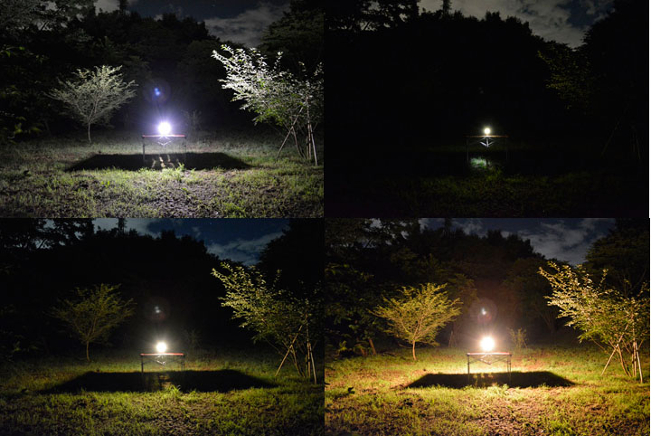 それ以外の3つを見ると、やはりガソリン仕様の「チューブマントルランタン」は明るいですね。最も遠くまで照らせていることも、正面奥の木を見れば分かります。